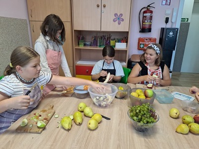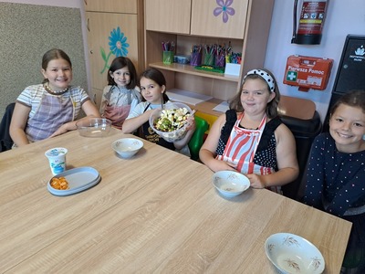 Uczennicy z klasy IV Lena Sikorska, Zofia Tabaczyńska, Wiktoria Tabaczyńska, Kalina Tomaszewska i Antonina Uszko jako pierwsze danie w czwartek przygotowały smaczną i zdrową sałatkę owocową. Podczas zajęć dziewczynki przypomniały sobie zasady prawidłowego odżywiania oraz dowiedziały się jakie wartości odżywcze mają poszczególne owoce.