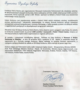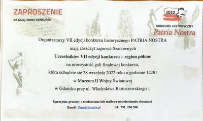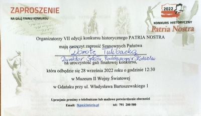 Z radością śpieszymy powiadomić, iż reprezentanci naszej szkoły w składzie: Krzysztof, Maciej i Hanna Bielscy wraz z opiekunem panią Kamilą Woźniak - Wachsman i panią Dyrektor Dorotą Tulibacką zostali zaproszeni na uroczystą galę finałową VII Konkursu Historycznego Patria Nostra Region Północny, która odbędzie się w Muzeum II Wojny Światowej w Gdańsku.