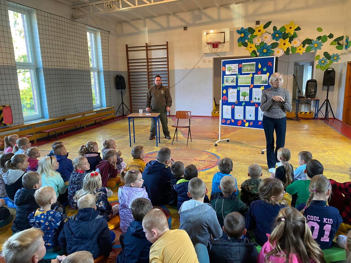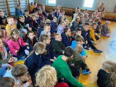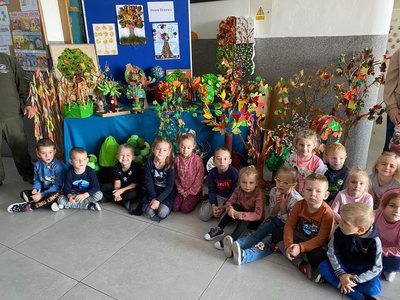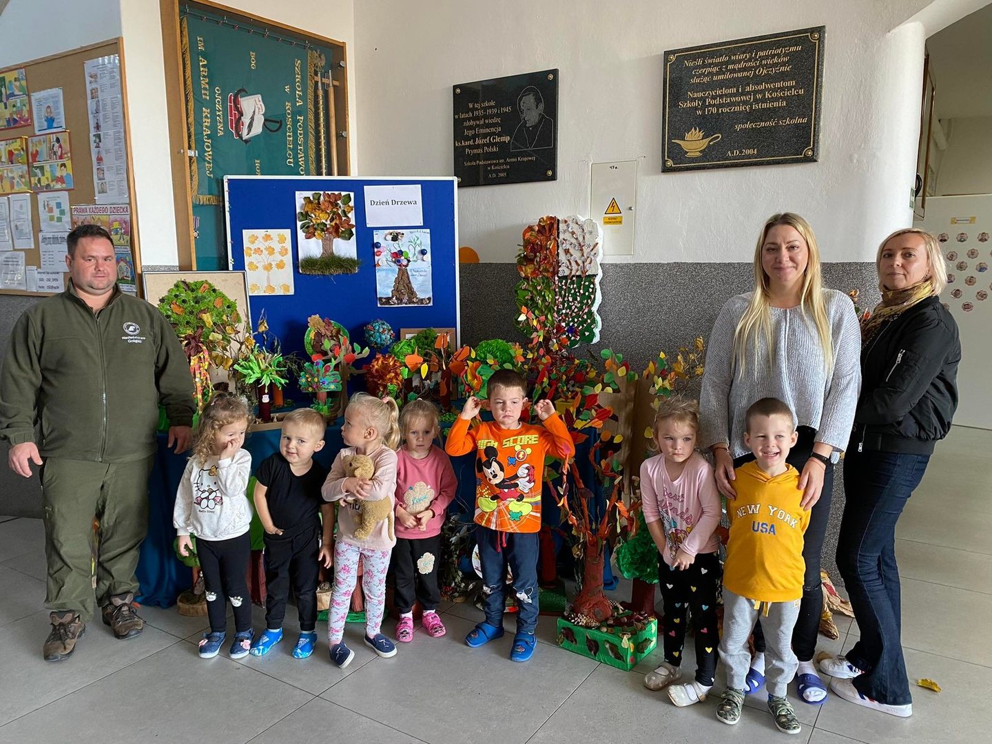 Uczniowie z klas I-III oraz przedszkolaki włączyli się aktywnie w obchody tego święta i do szkoły zaprosili na spotkanie podleśniczego Bartłomieja Ważnego z Nadleśnictwa Mierucinek. Dzieci z dużym zainteresowaniem słuchały ciekawostek o lesie. Dowiedziały się jakie są gatunki drzew, do czego wykorzystujemy drewno, ile tlenu produkuje las. Poznały mieszkańców lasu i sposoby ochrony przyrody. Leśniczy zwrócił też szczególną uwagę jak powinniśmy zachowywać się w lesie, żeby nie wystarczyć ich mieszkańców ponieważ las to ich dom, a my jesteśmy tylko gośćmi. Dzieci zadawały dużo ciekawych pytań. Pod koniec spotkania Pań leśniczy przygotował dla uczniów niespodziankę, przywiózł 27 sadzonek drzew iglastych, które wspólnie posadziliśmy i w ten sposób dołączyliśmy to akcji #wyzwanieDzieńDrzewa.