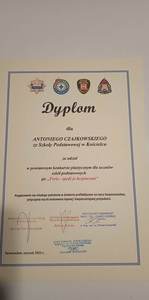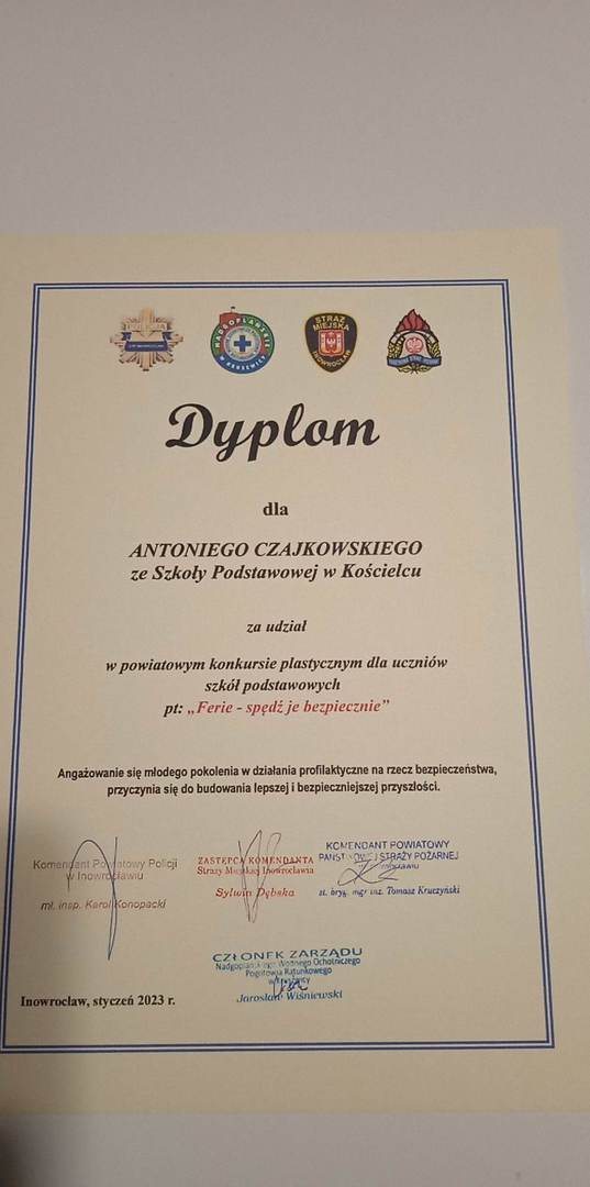 Miło nam poinformować, że Antoni Czajkowski z klasy III otrzymał wyróżnienie w powiatowym konkursie plastycznym pt. " Ferie - spędź je bezpieczne". Organizatorem konkursu byli: Komenda Powiatowa Policji w Inowrocławiu, Nadgoplańskie WOPR w Kruszwicy, Straż Miejska Inowrocławia, Komenda Powiatowa Państwowej Straży Pożarnej w Inowrocławiu. Celem konkursu było w jasny sposób przedstawić zasady bezpiecznego spędzania ferii zimowych w domu, na dworzu i podczas feryjnychwyjazdów.