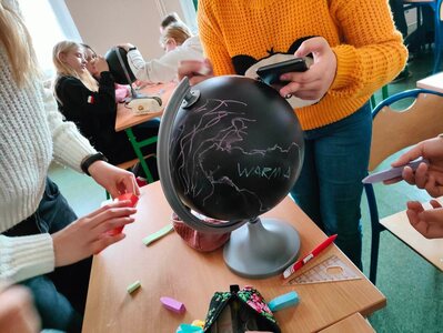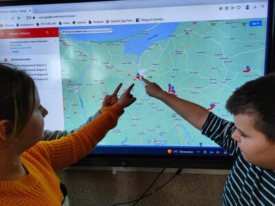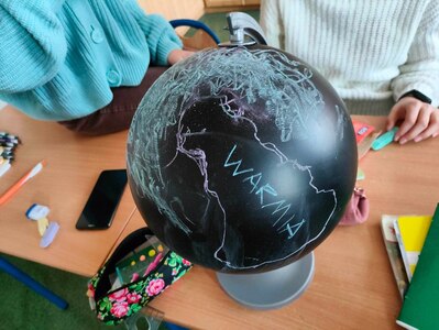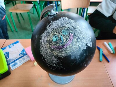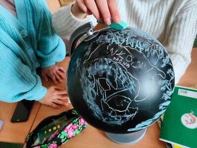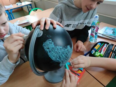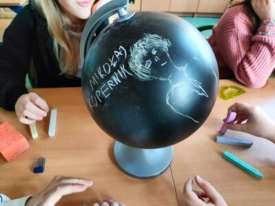 Uczniowie klasy V zakończyli udział w Programie "Szkoła Przyjaciół Kopernika" przeprowadzając żywą lekcje historii z uwzględnieniem interaktywnej mapy z miejscami pobytu Mikołaja Kopernika. Podsumowując swoją pracę przenieśli wytypowaną drogę na globusy suchościeralne.