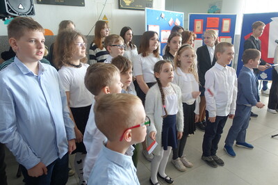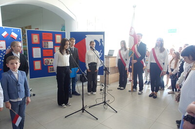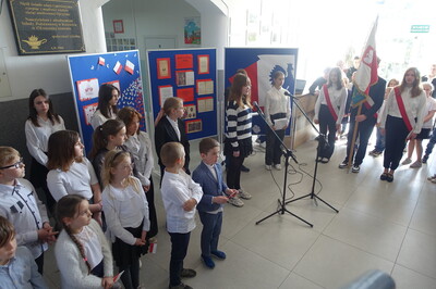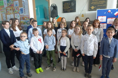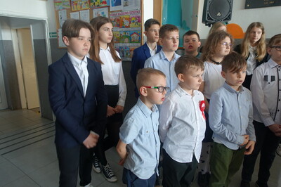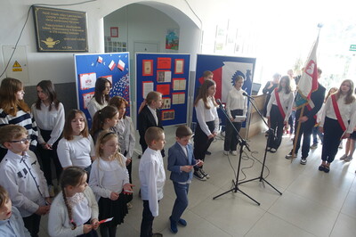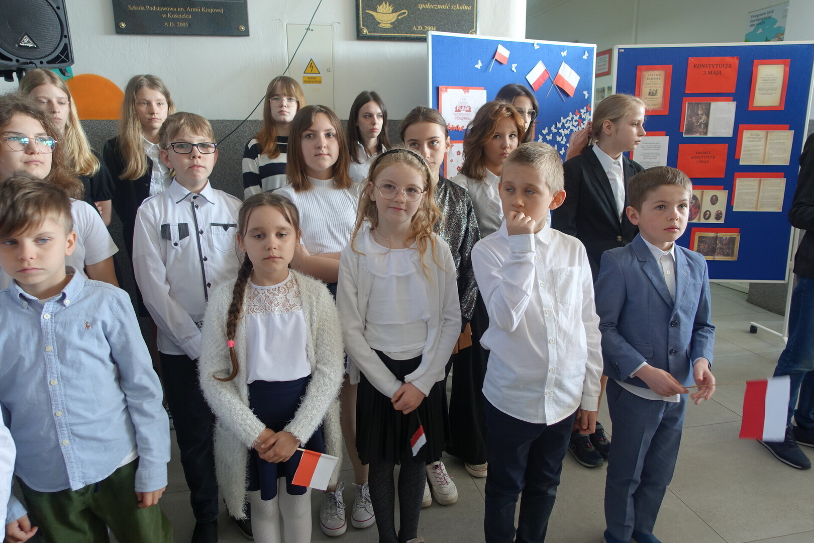 Na uroczystym apelu uczniowie Szkoły Podstawowej w Kościelcu uczcili zbliżające się Święto Konstytucji 3 Maja, Święto Pracy