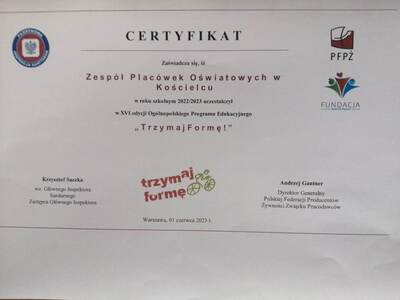 Miło jest nam poinformować, że nasza szkoła otrzymała certyfikat uczestnictwa w XVI edycji ogólnopolskiego Programu Edukacyjnego „TRZYMAJ FORMĘ”
