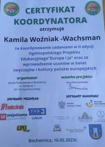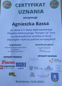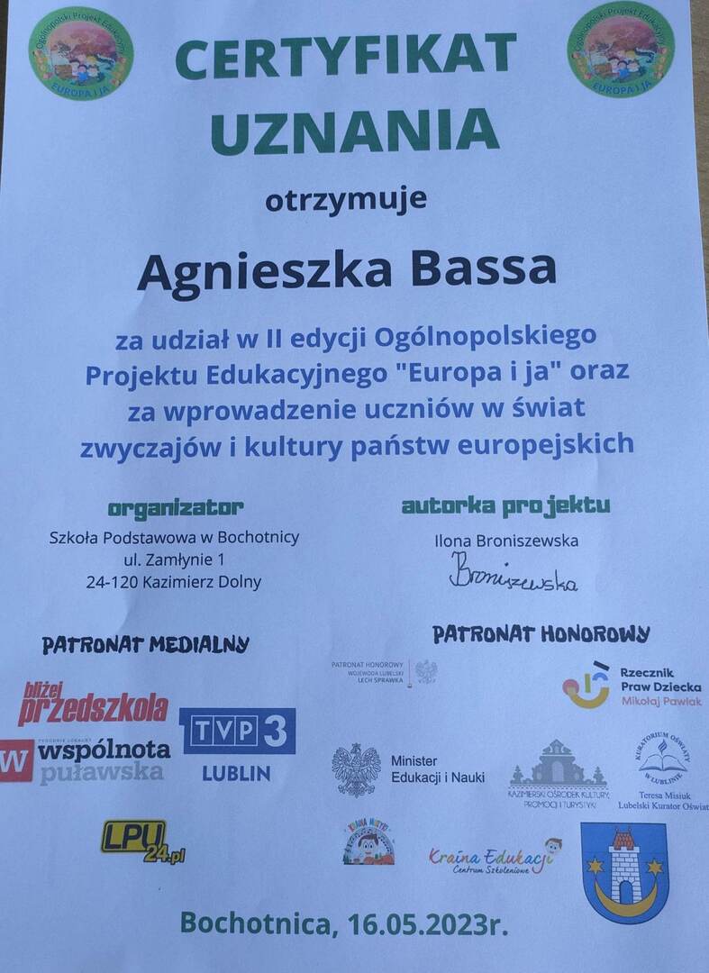 Miło jest nam poinformować, że nasza szkoła otrzymała certyfikat uczestnictwa w II edycji Ogólnopolskiego Projektu Edukacyjnego „Europa i ja ” pod honorowym patronatem Ministra Edukacji i Nauki oraz Rzecznika Praw Dziecka, którego celem było wprowadzenie uczniów w świat zwyczajów i kultury europejskiej. Uczestnikami programu byli uczniowie klasy IV, którzy realizując projekt o charakterze innowacji pedagogicznej omawiali Włochy.