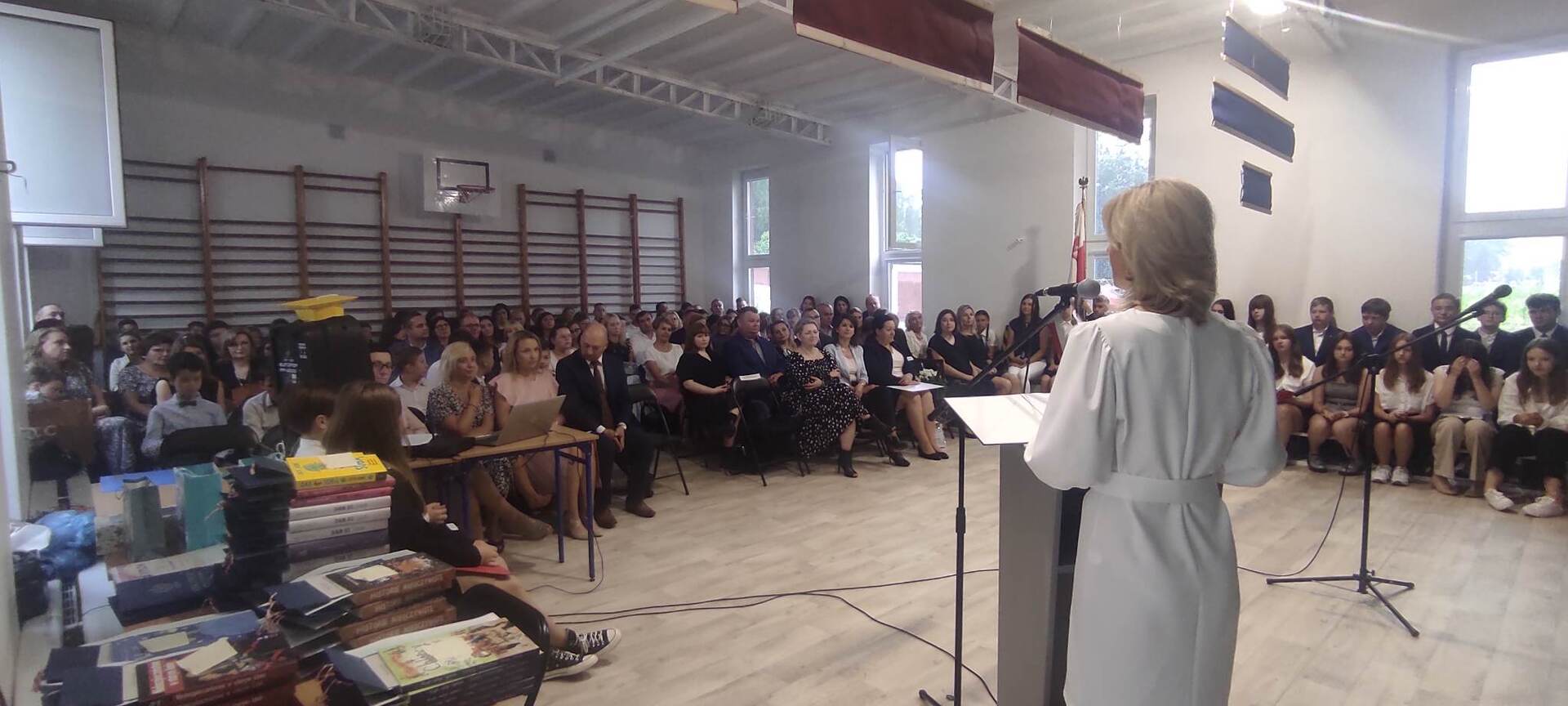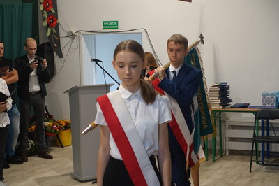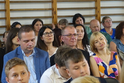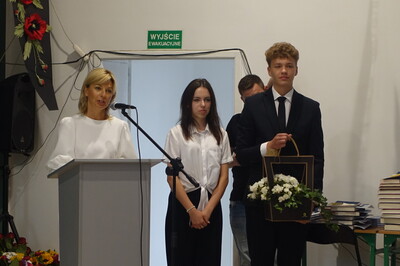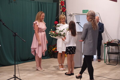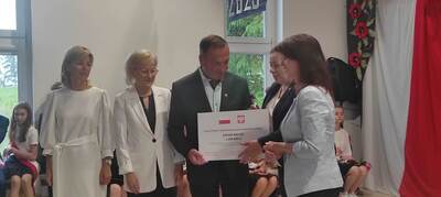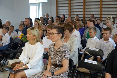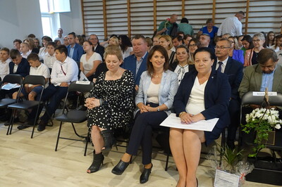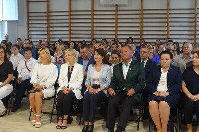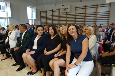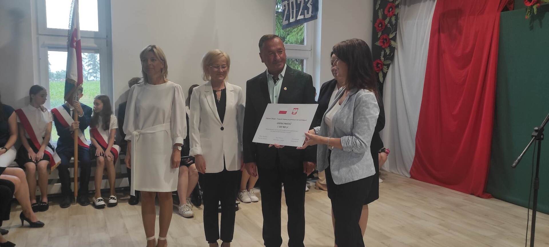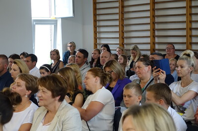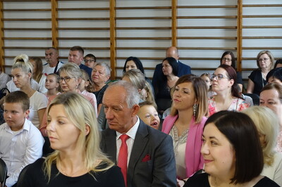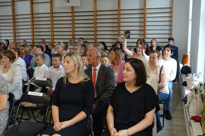 Naszą uroczystość zaszczyciło dużo gości, a jej gospodarzem była Pani Dyrektor Dorota Tulibacka. W trakcie uroczystości byliśmy świadkami przekazania na ręce Burmistrza Pakości Zygmunta Gronia, przez posła na Sejm RP Ewę Kozanecką promesy o wartości prawie 1370000 zł. z Programu „Olimpia” Ministerstwa Sportu i Turystyki. Program ten dofinansowuje budowę przyszkolnych hal sportowych lub budowę zadaszenia istniejących boisk. W naszym przypadku projekt dotyczy budowy zadaszenia boiska wielofunkcyjnego wybudowanego w 2021 roku przy wsparciu finansowym środkami z Programu Rozwoju Obszarów Wiejskich.