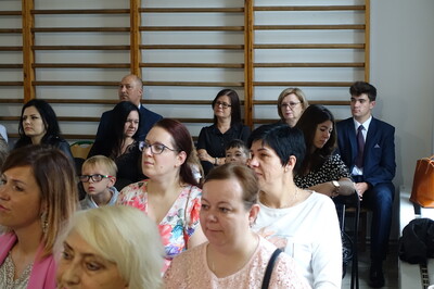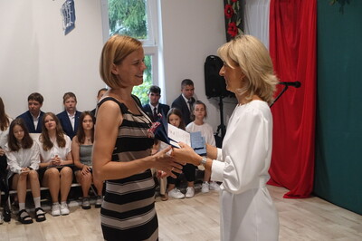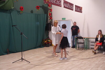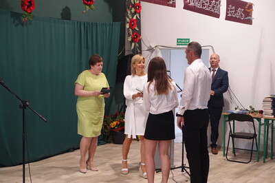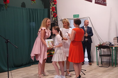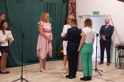Dużo się jeszcze działo na uroczystości zakończenia roku szkolnego. Uczniowie, którzy osiągnęli najwyższe noty w nauce i zachowaniu otrzymali nagrody, które ufundowała i wręczyła Rada Rodziców, a także Urząd Miejski – te niespodzianki uczniowie otrzymali z rąk zastępcy burmistrza p. R. Sieleckiej. Pani Dyrektor odczytała list naszego absolwenta, pana Tadeusza Bogusza, który nie zapomina o takich okazjach i przysłał nam szczególnie miłe życzenia wesołych i pełnych wrażeń wakacji. Zresztą, życzeń i podziękowań nie było końca. Pożegnaliśmy państwa Elżbietę i Marka Nowaków, którzy po wieloletniej pracy przechodzą na emeryturę. Życzymy im zdrowia i aby emerytura była początkiem nowego, dobrego i wolnego od trosk czasu poświęconego swoim zainteresowaniom i odpoczywaniem.