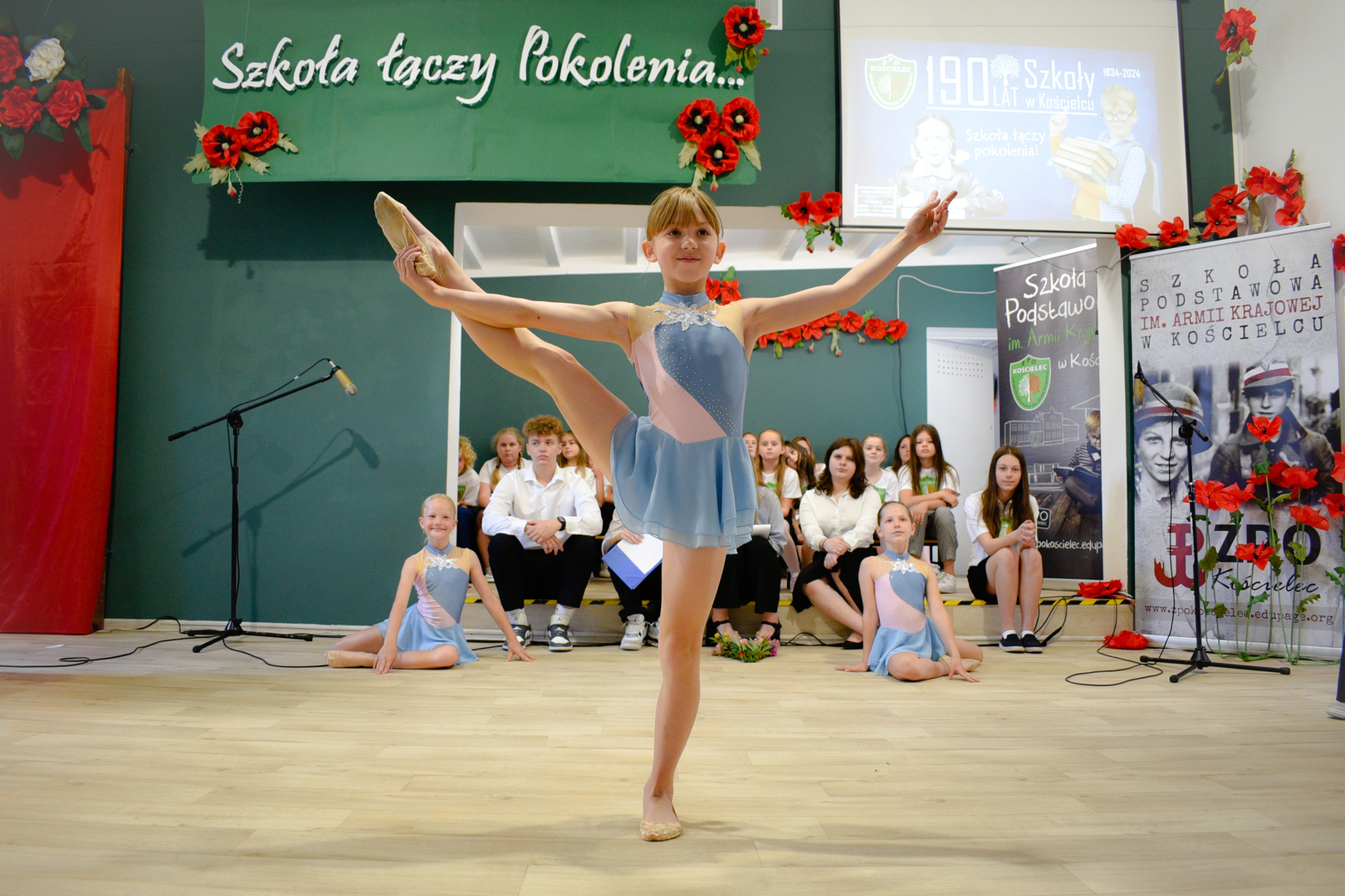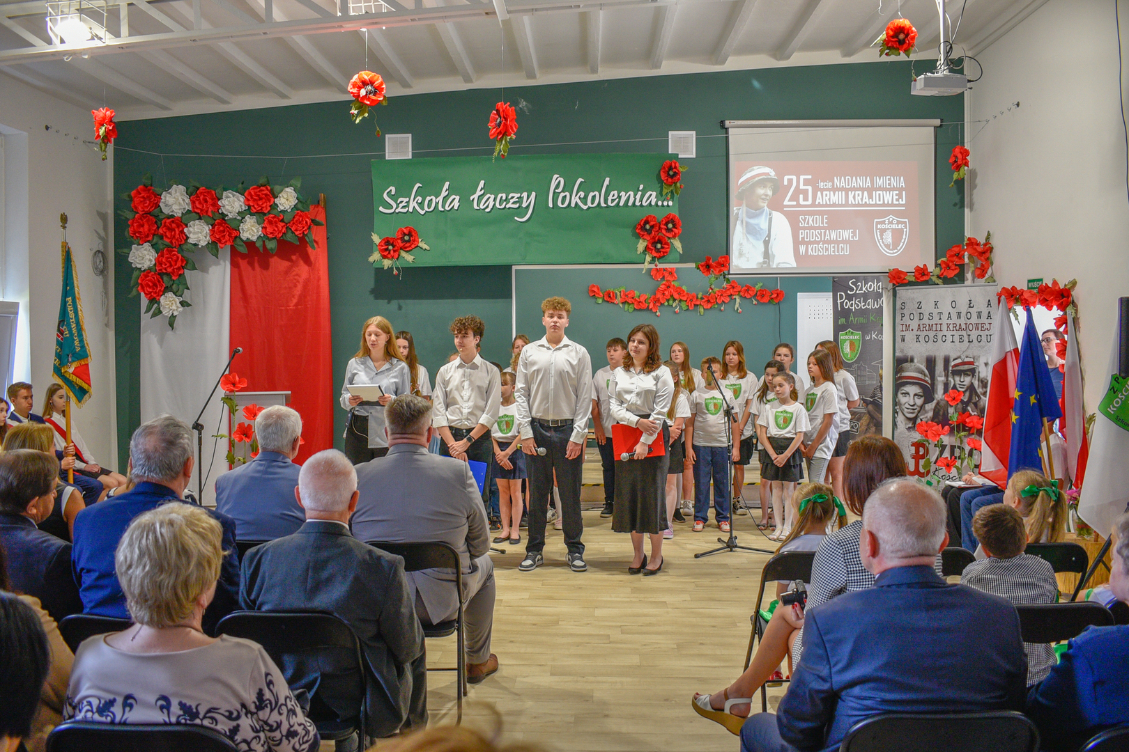 ,,Szkoła łączy pokolenia”. Pod takim hasłem przebiegał w szkole Rok Jubileuszowy. 22 maja odbyła się uroczystość, która wieńczyła cykl wydarzeń związanych ze 190 rocznicą powstania Szkoły Podstawowej w Kościelcu i 25 rocznicą nadania jej imienia Armii Krajowej. Było to niezwykłe wydarzenie, pełne emocji i wzruszeń. Uczestniczyli w niej przedstawiciele władz z Urzędu Miejskiego w Pakości, na czele z burmistrzem panem Michałem Siembabem. Ponadto swoją obecnością zaszczycili: przewodniczący Rady Miejskiej pan Franciszek Kochanowski wraz z radnymi, starszy wizytator Kuratorium Oświaty w Bydgoszczy pani Agnieszka Molenda, radny Rady Powiatu pan Wiesław Kończal, kierownik Centrum Usług Wspólnych w Pakości pani Agnieszka Chlebicka oraz byli dyrektorzy Szkoły Podstawowej w Kościelcu, dyrektorzy placówek oświatowych w gminie, kierownicy jednostek administracyjnych, wiceprezes ŚZŻAK w Pakości pani Róża Sielecka, przedstawiciele zaprzyjaźnionych i współpracujących instytucji. Oczywiście nie mogło zabraknąć naszych absolwentów, obecnych i byłych nauczycieli i pracowników niepedagogicznych, rodziców i uczniów. Warto zauważyć, że obecni na uroczystości pan Tadeusz Bogusz został naszym absolwentem w 1952 r. a pan Ryszard Jagodziński w 1962 r.