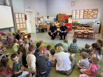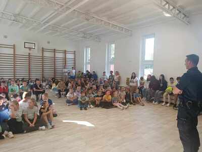 Policjanci sier. szt. Robert Wojtalak oraz asp. szt. Mariusz Wardecki rozmawiali z dziećmi o podstawowych zasadach bezpieczeństwa w ruchu drogowym, podkreślili ważną rolę elementów odblaskowych, które każdy uczeń powinien posiadać. Przypomnieli również zasady jakie należy stosować w kontaktach z obcymi. Ponadto funkcjonariusze poruszyli temat cyberprzemocy i skutków, jakie może nieść za sobą niewłaściwe korzystanie z Internetu.