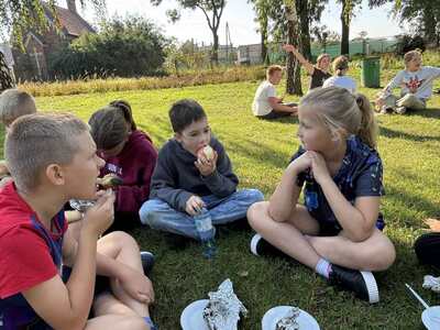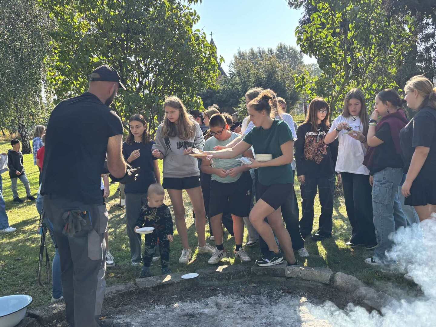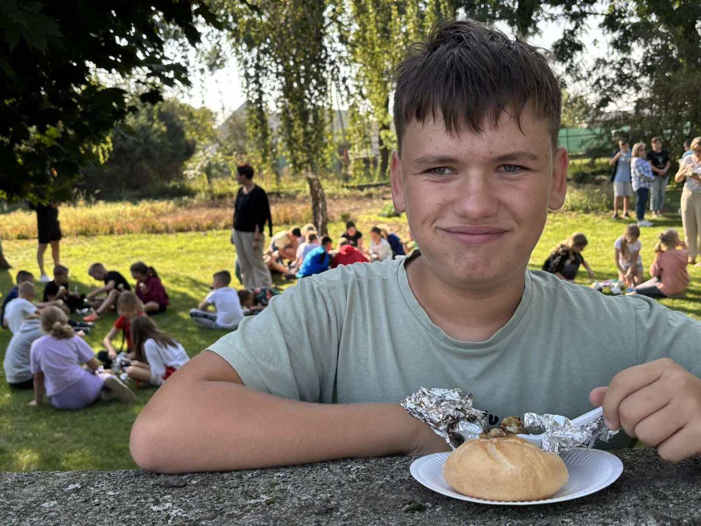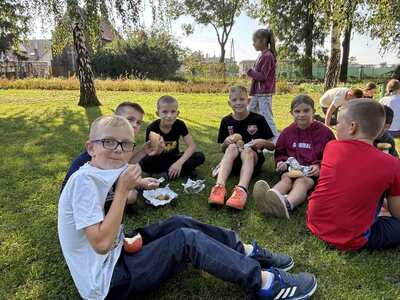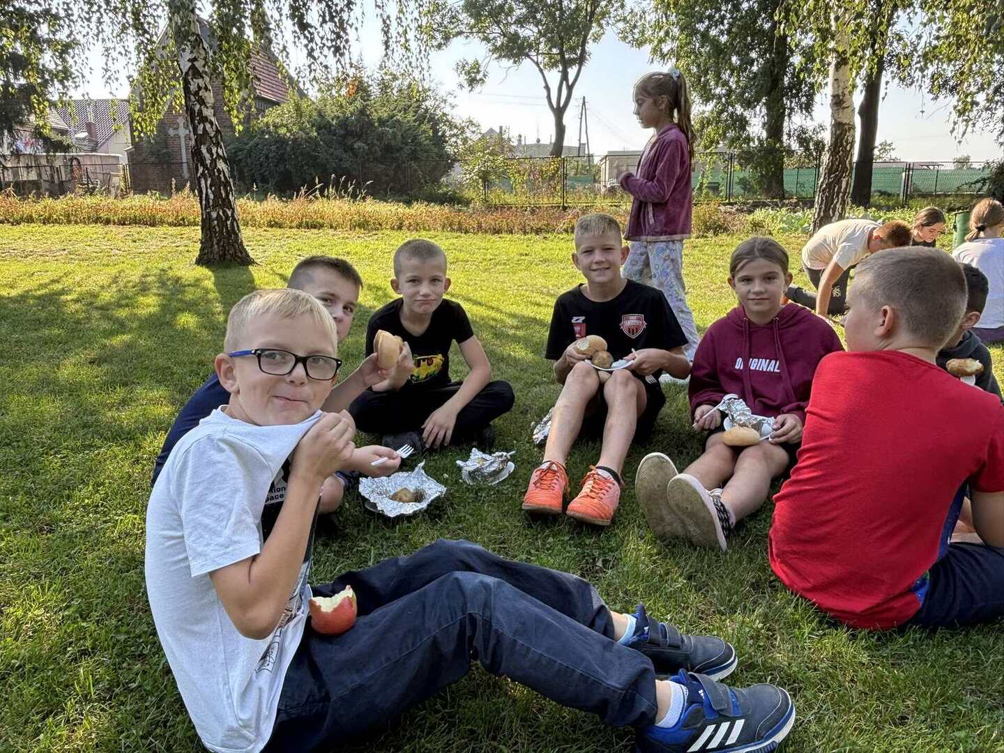 Słowa wdzięczności dla pana Michała Bogusza, który zapewnił drewno na ognisko i obdarował wszystkich uczniów owocowym deserem- pysznymi jabłkami.