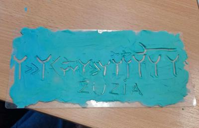 Młodzi historycy z klasy V podjęli się próby odwzorowania pisma klinowego, które powstało z uproszczonego pisma obrazkowego.