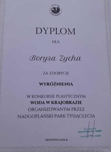 Nadgoplański Park Tysiąclecia organizował konkurs plastyczny "Woda w krajobrazie", którego celem było przedstawienie wody jako elementu krajobrazu. Spośród 150 prac nadesłanych w kategorii wiekowej uczniów klas I-III wyróżniono rysunek ucznia z klasy III, Borysa Zycha. Praca chłopca wyróżniała się wyjątkową oryginalnością w ujęciu tematu. Widać też samodzielność w jej wykonaniu.