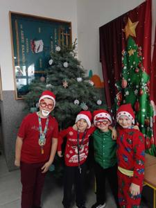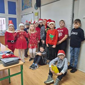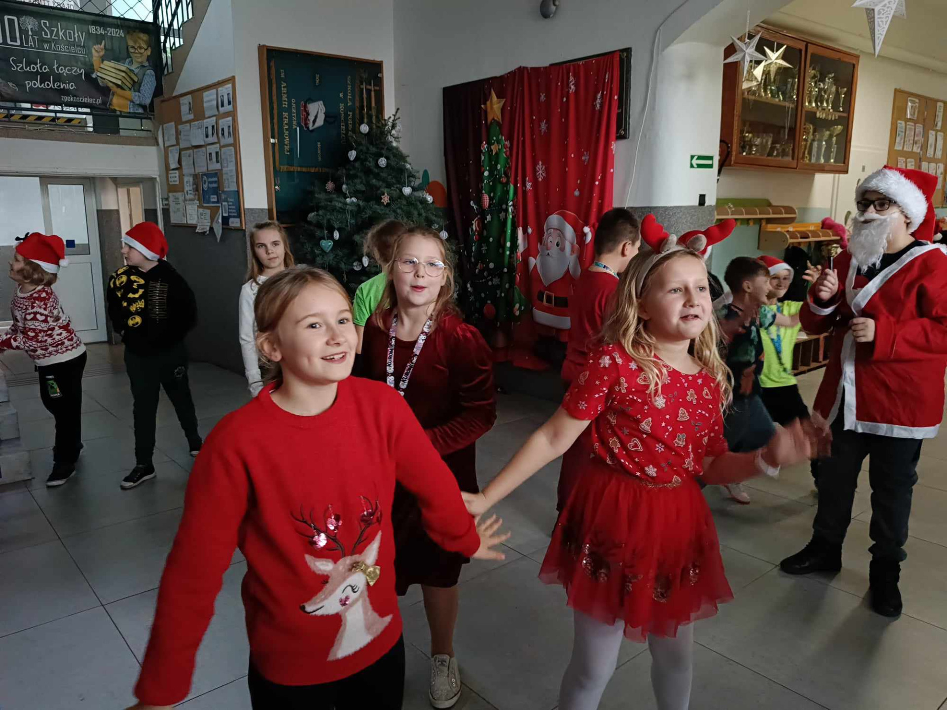 w wyjątkowym, tanecznym stylu! Już od rana atmosfera była przepełniona świątecznym duchem – korytarze udekorowane lampkami i choinką, a uczniowie w czerwonych czapkach i świątecznych ubrankach wprowadzili wszystkich w radosny nastrój