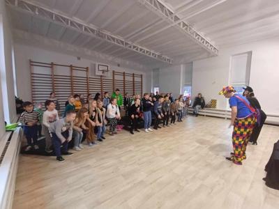 Uczniowie klas IV-VI w prezentacji "Szkolne tarapaty" zostali zapoznani z historią dwójki przyjaciół, którzy borykają się z presją otoczenia w kwestii bycia na topie. Podczas tego spotkania zostały poruszone takie zagadnienia jak: wpływ grupy rówieśniczej, uleganie obowiązującym trendom, nieumiejętność podejmowania racjonalnych decyzji w wieku dorastania i przewidywania konsekwencji podjętych decyzji.