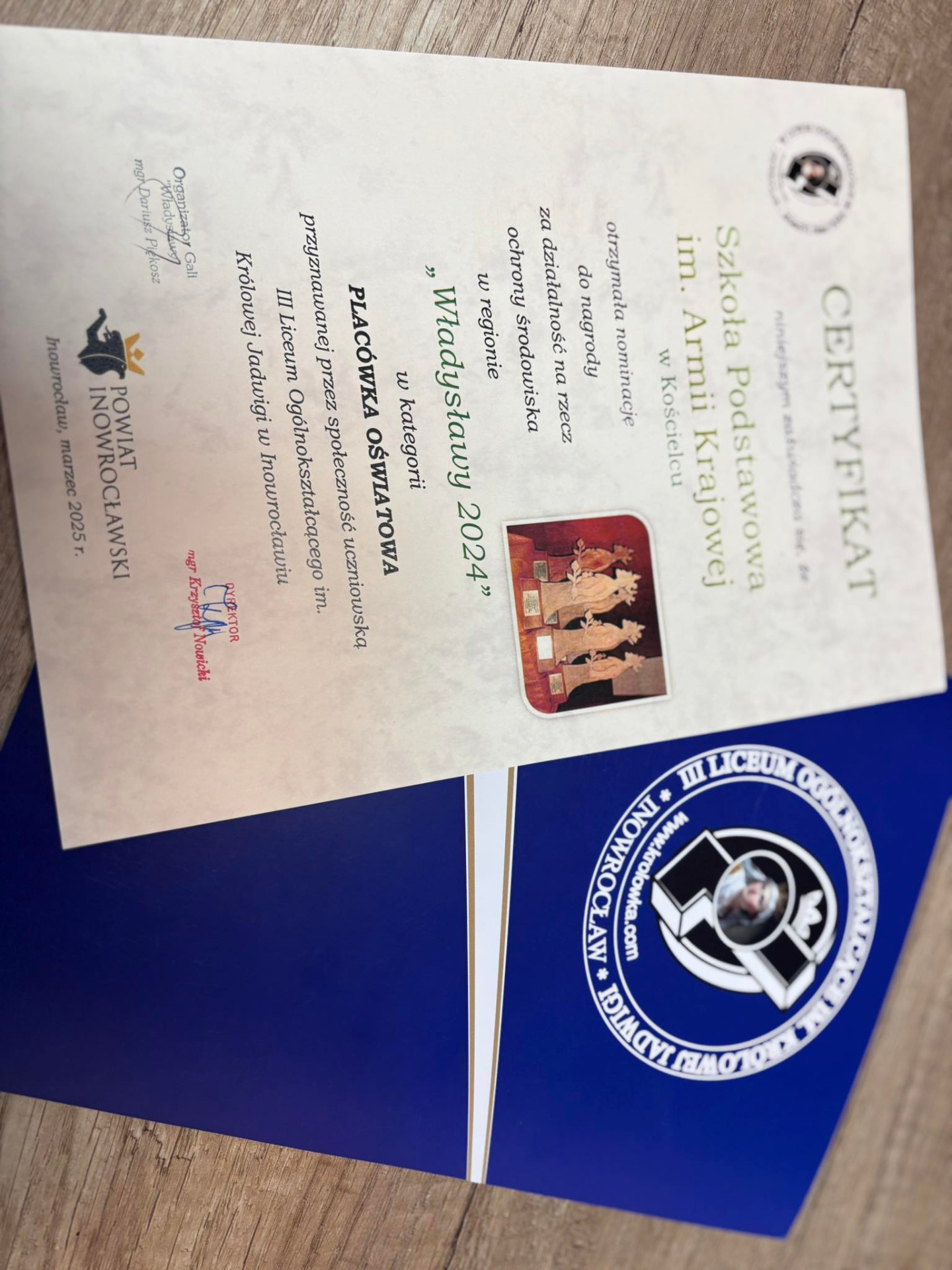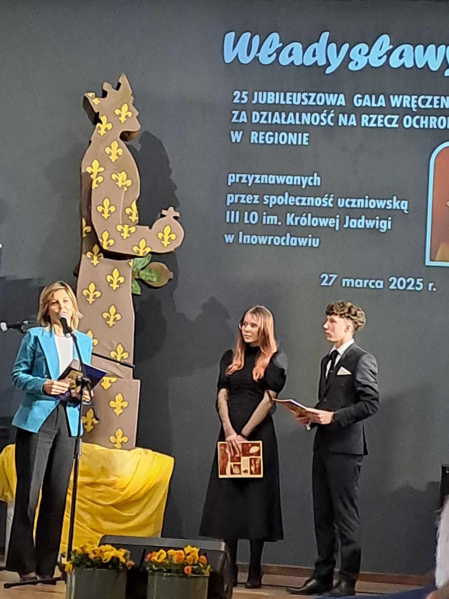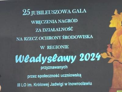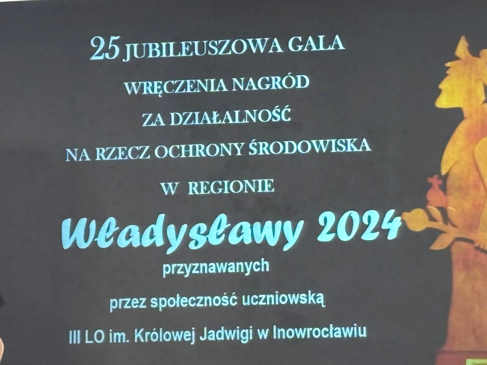 W czwartek 27 marca br mieliśmy zaszczyt uczestniczyć w XXV Jubileuszowej Gali wręczenia nagród za działalność na rzecz ochrony środowiska w regionie WŁADYSŁAWY 2024 przyznawanych przez społeczność uczniowską III Liceum Ogólnokształcącego im. Królowej Jadwigi w Inowrocławiu.