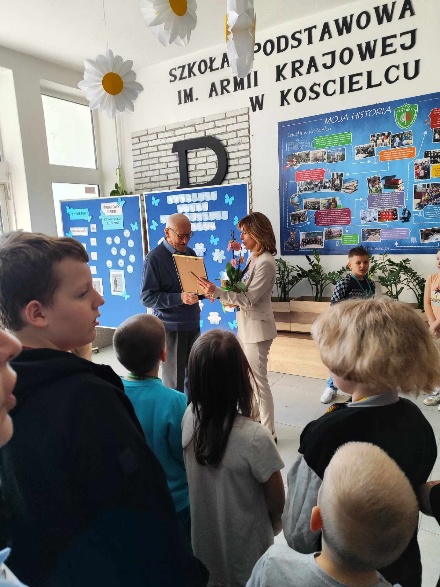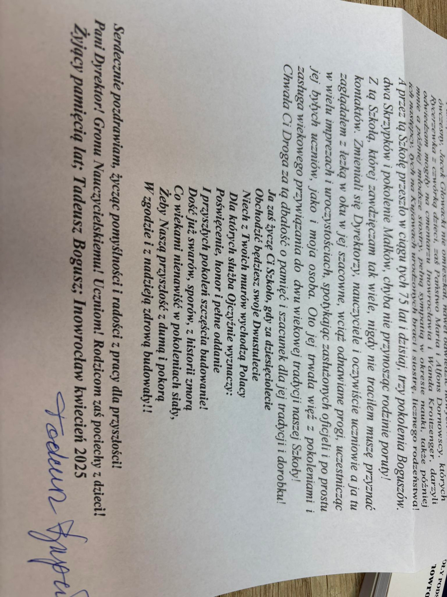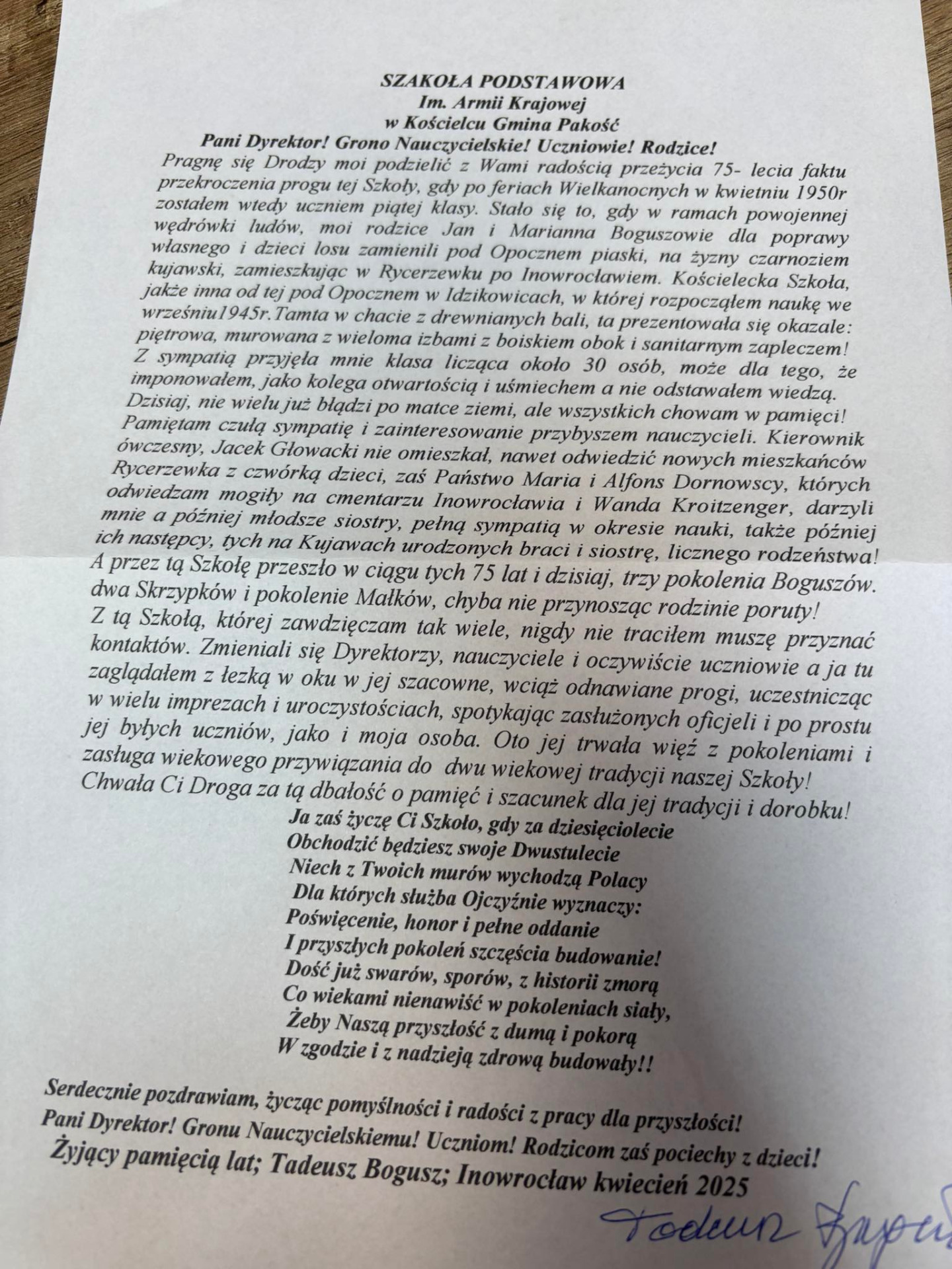 Panie Tadeuszu! Dziękujemy za piękne spotkanie, wspomnienia, kolejny wzruszający list i książki Pana autorstwa, które są niezwykle cenną spuścizną dla nas. Wartością tego miejsca –kościeleckiej szkoły –są przede wszystkim ludzie, ich przeżycia i działania. Dziękujemy za piękną kolejną lekcję dla uczniów, czekamy na kolejne spotkania, życzymy nieustającego zdrowia! Społeczność szkolna pozdrawia serdecznie!