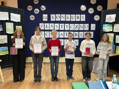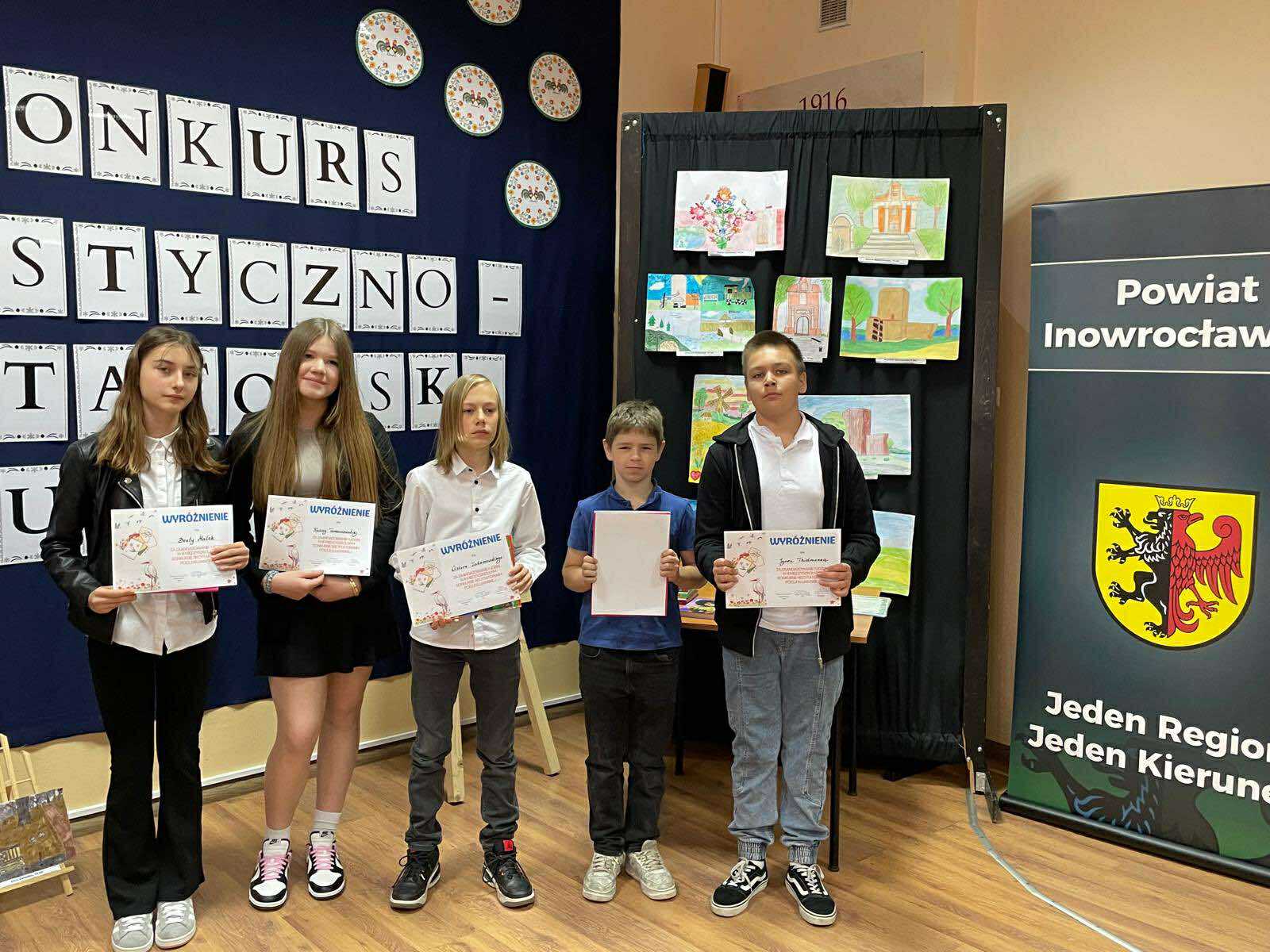 W części plastycznej konkursu noszącego tytuł "Walory przyrodnicze i kulturowe ziemi kujawskiej" naszą szkołę reprezentowali: Beata Małek kl. VII, Lena Wodzińska kl. VII, Cezary Dutka kl. VII, Liliana Łukowska kl. VII, Maria Batlińska kl. VII i Zuzanna Stępniewska kl. V.