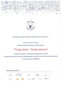 Miło nam poinformować, iż otrzymaliśmy certyfikat udziału w XV edycji ogólnopolskiego programu edukacyjnego "Twoje dane- Twoja sprawa". W ramach programu odbywały się zajęcia dla uczniów i spotkania szkoleniowe kadry pedagogicznej z zakresu ochrony danych osobowych w roku szkolnym 2024/2025.