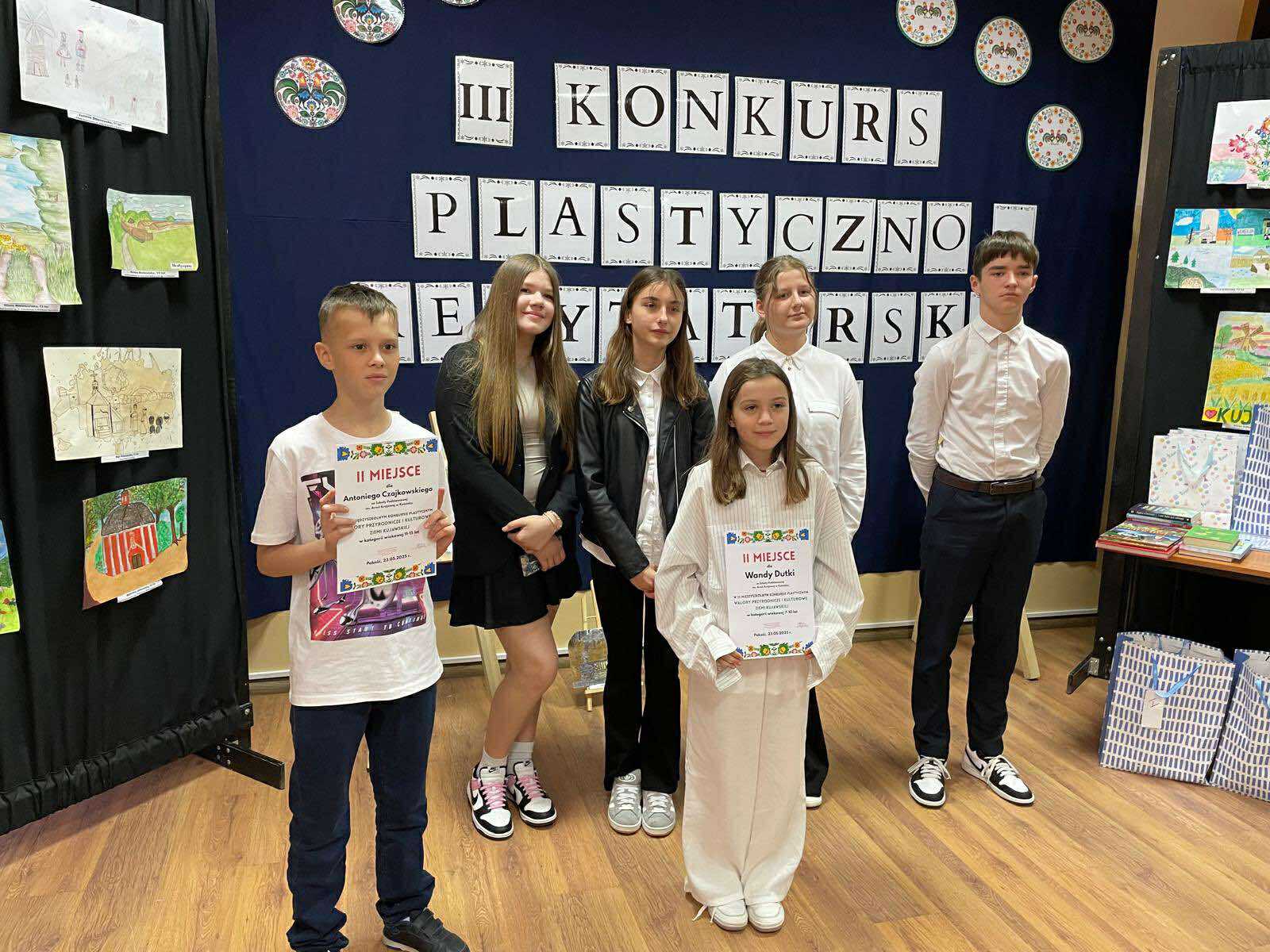 W części plastycznej konkursu noszącego tytuł "Walory przyrodnicze i kulturowe ziemi kujawskiej" naszą szkołę reprezentowali: Beata Małek kl. VII, Lena Wodzińska kl. VII, Cezary Dutka kl. VII, Liliana Łukowska kl. VII, Maria Batlińska kl. VII i Zuzanna Stępniewska kl. V.