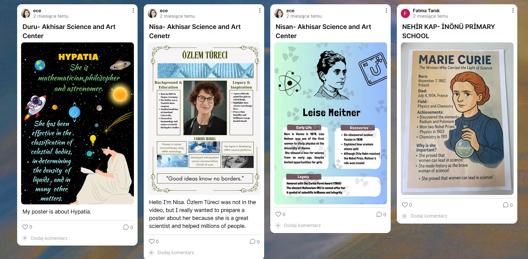 Podczas wspólnych działań młodzież poznawała życiorysy wyjątkowych kobiet naukowców, tworzyła plakaty, komiksy, prezentacje multimedialne, oglądała filmy edukacyjne, a także miała możliwość zaprezentowania piękna naszej miejscowości i regionu.