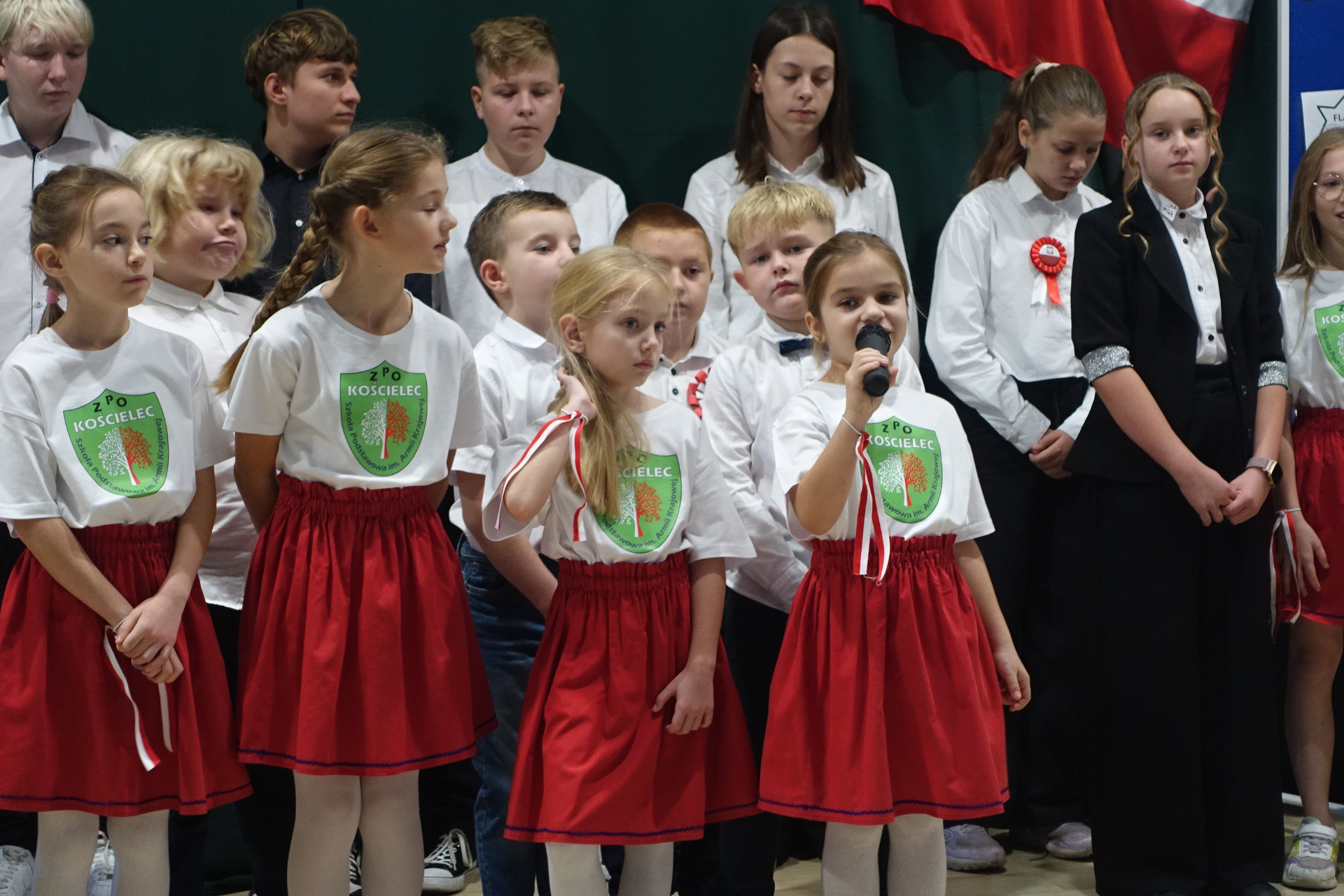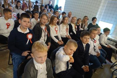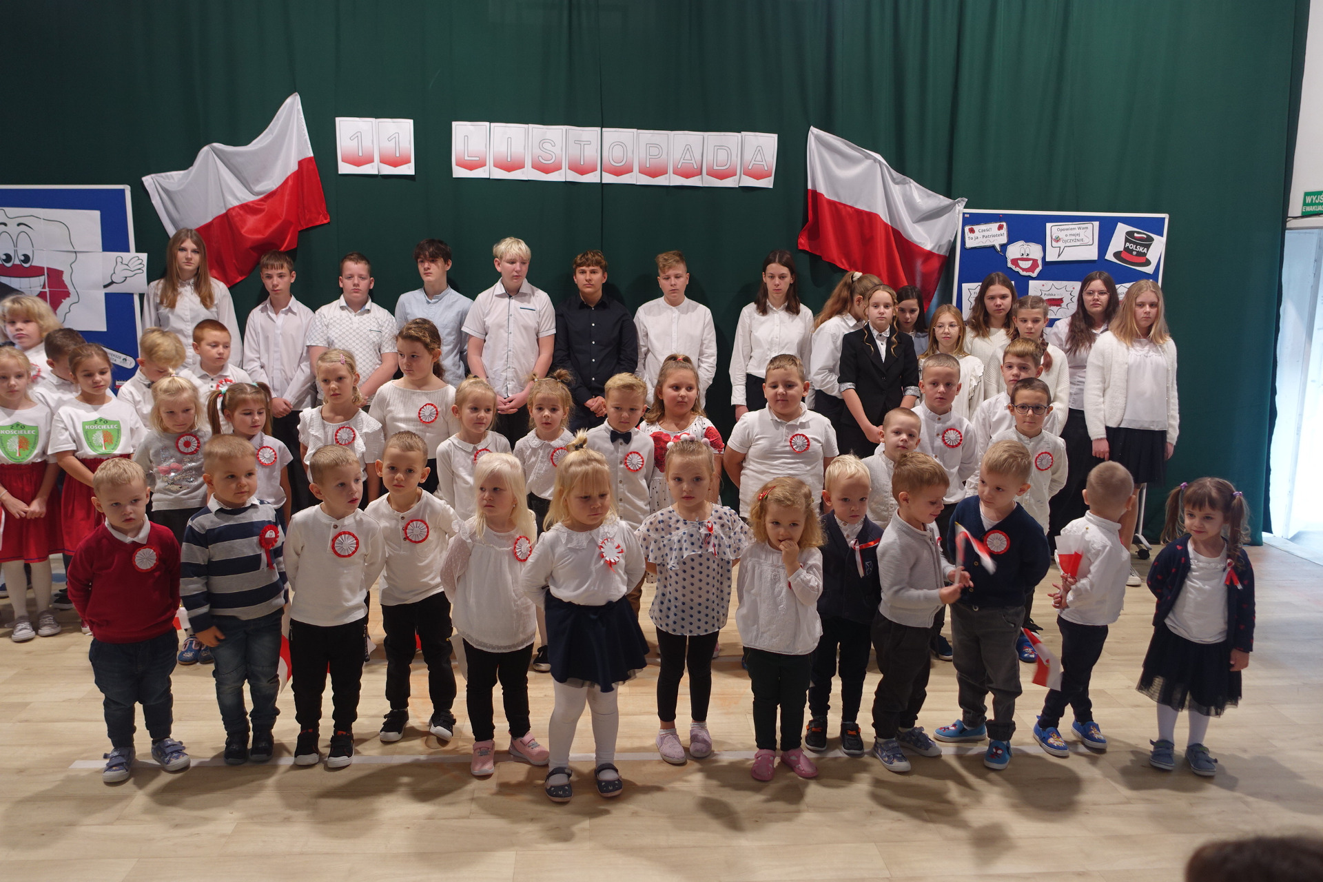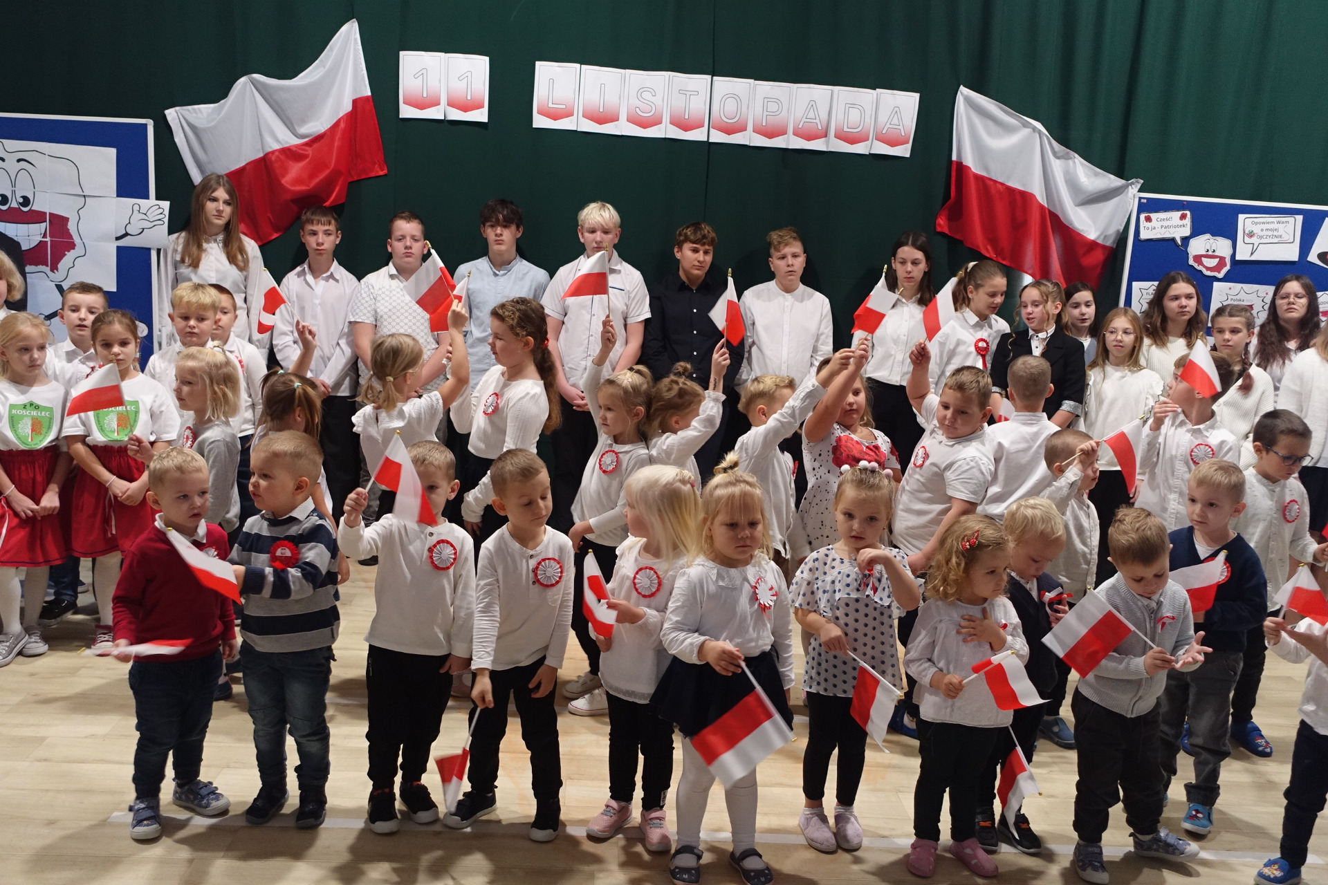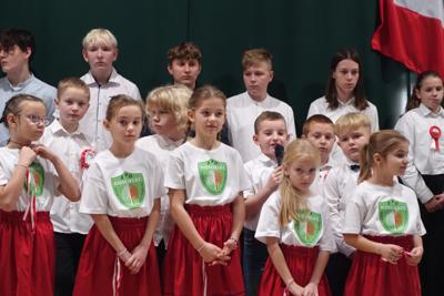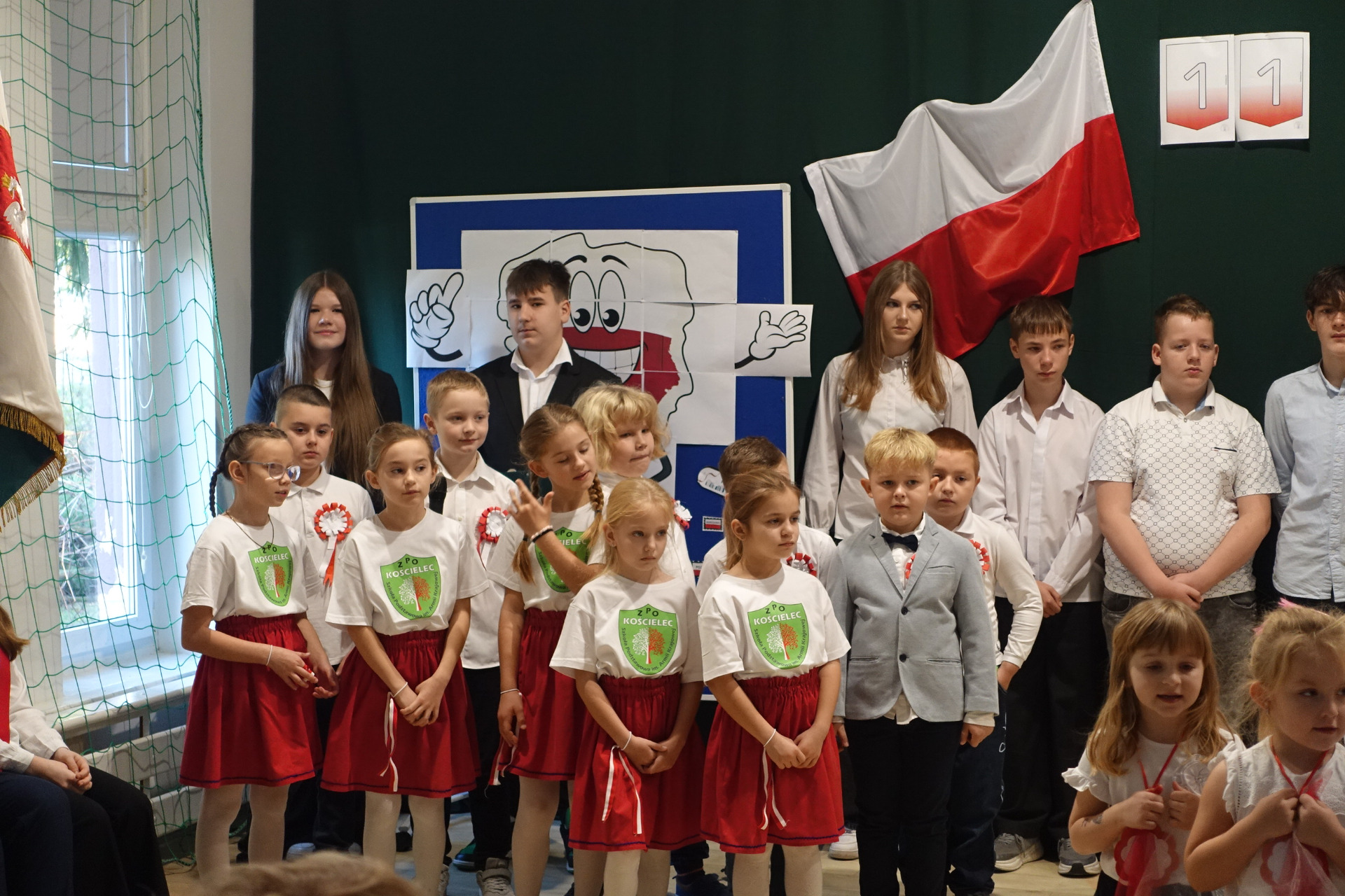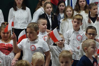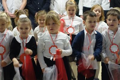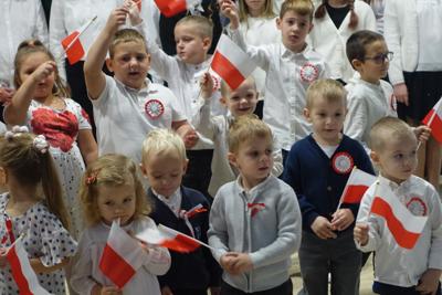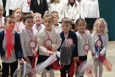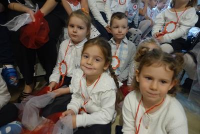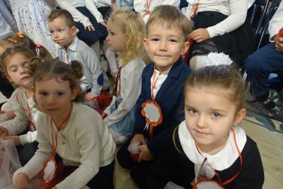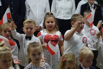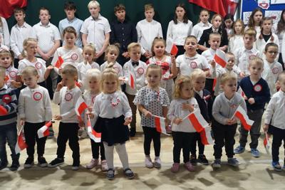–tymi słowami piosenki przedszkolacy rozpoczęli uroczyste piątkowe spotkanie szkolnej społeczności z okazji Święta Niepodległości. 107 rocznica odzyskania niepodległości zgromadziła przedszkolaków, uczniów, nauczycieli oraz rodziców kościeleckiej placówki, a została uczczona we wzruszających słowach wierszy, pieśni oraz przepięknego wykonania poloneza przez uczniów klasy 2. Dyrektor szkoły p. Dorota Tulibacka podkreśliła znaczenie słynnych słów Jana Pawła II:
