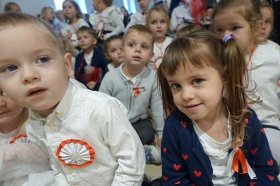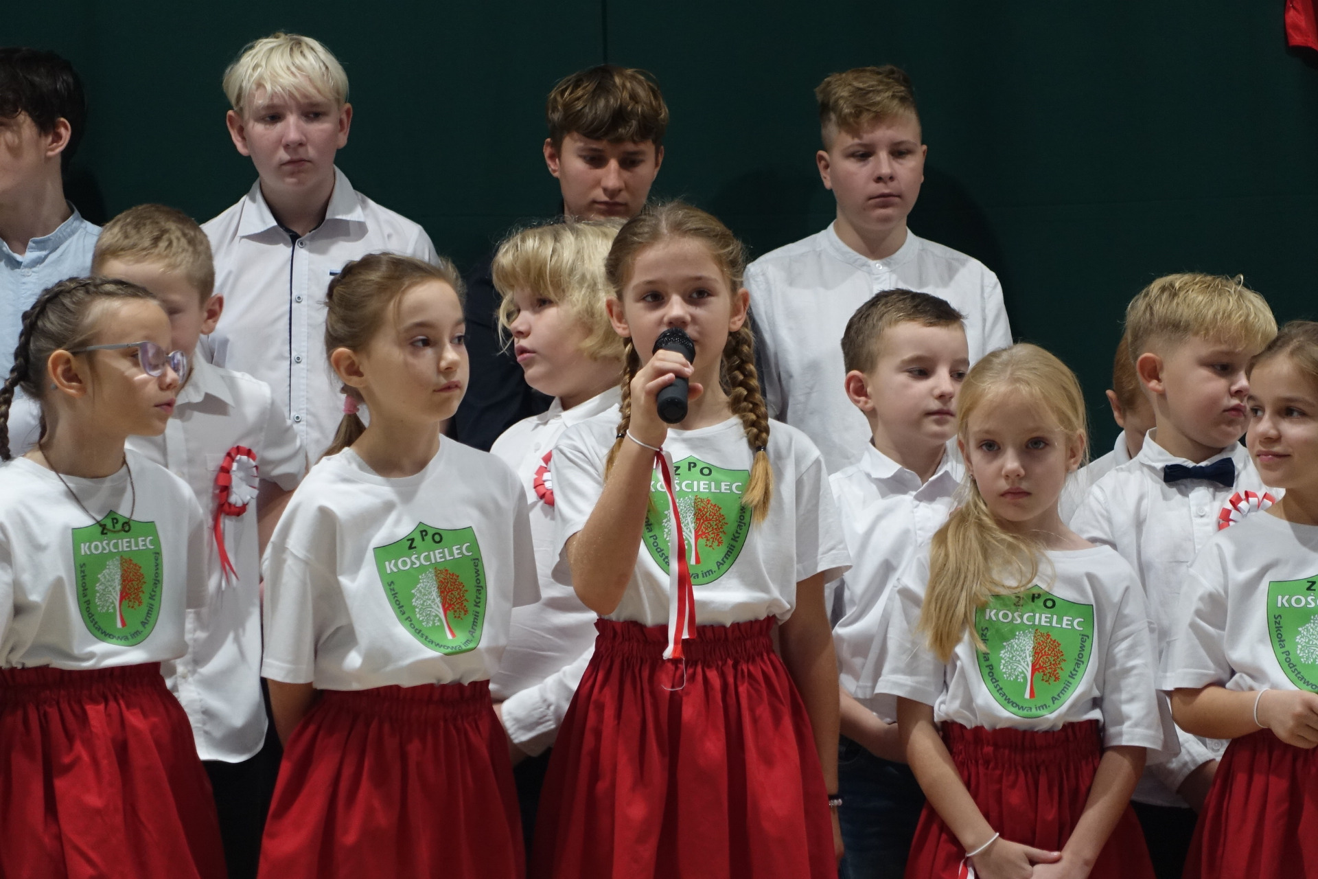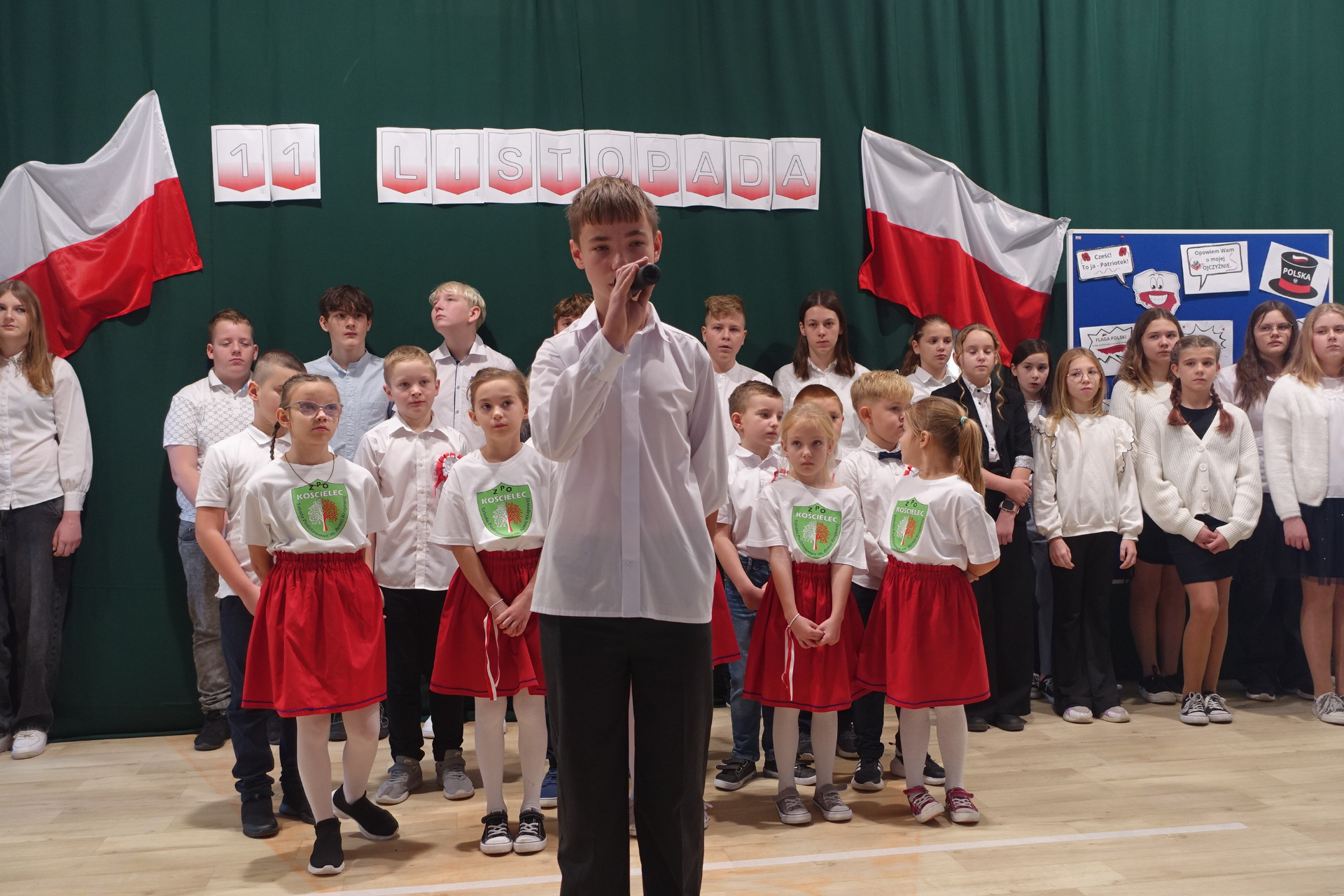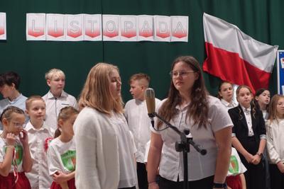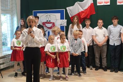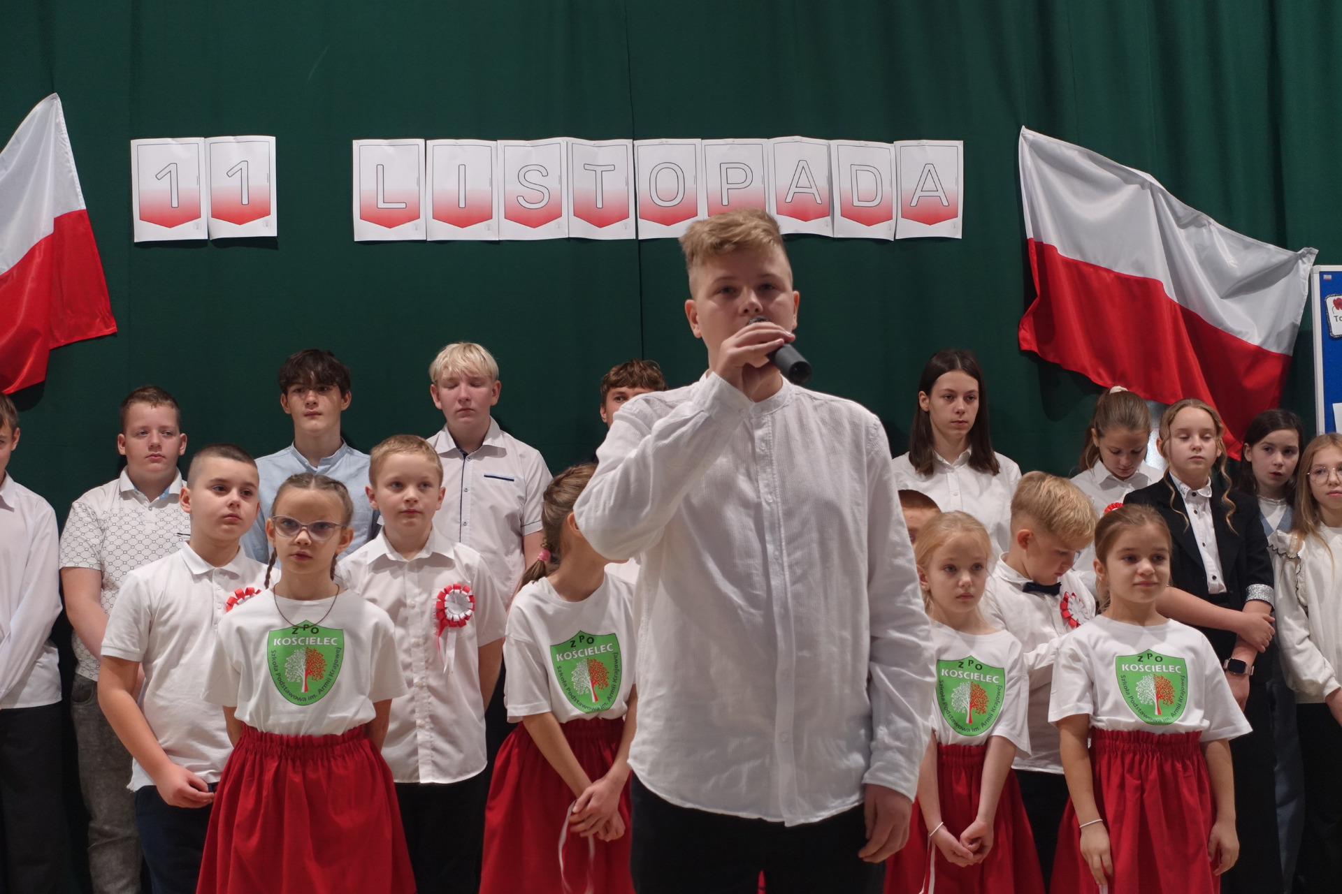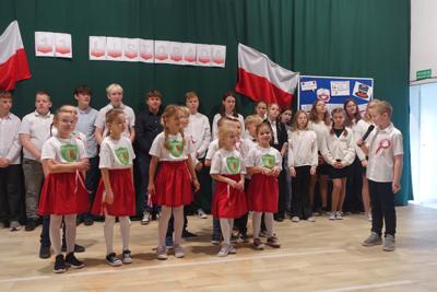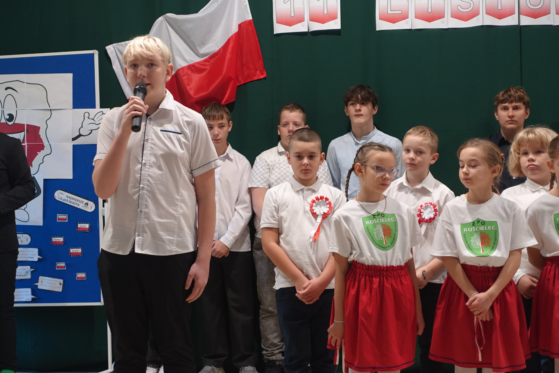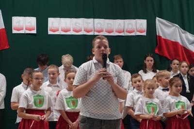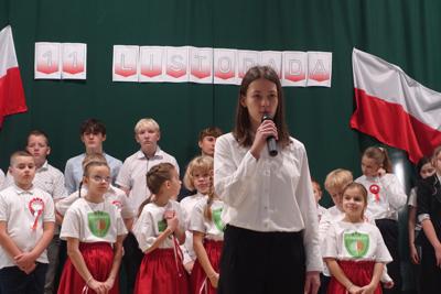 –tymi słowami piosenki przedszkolacy rozpoczęli uroczyste piątkowe spotkanie szkolnej społeczności z okazji Święta Niepodległości. 107 rocznica odzyskania niepodległości zgromadziła przedszkolaków, uczniów, nauczycieli oraz rodziców kościeleckiej placówki, a została uczczona we wzruszających słowach wierszy, pieśni oraz przepięknego wykonania poloneza przez uczniów klasy 2. Dyrektor szkoły p. Dorota Tulibacka podkreśliła znaczenie słynnych słów Jana Pawła II: