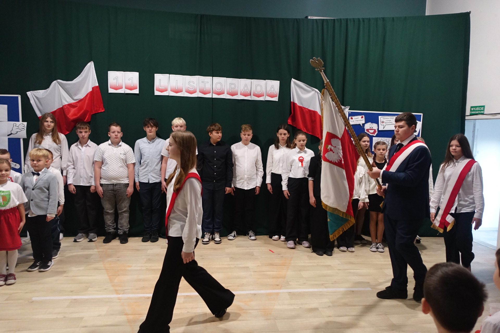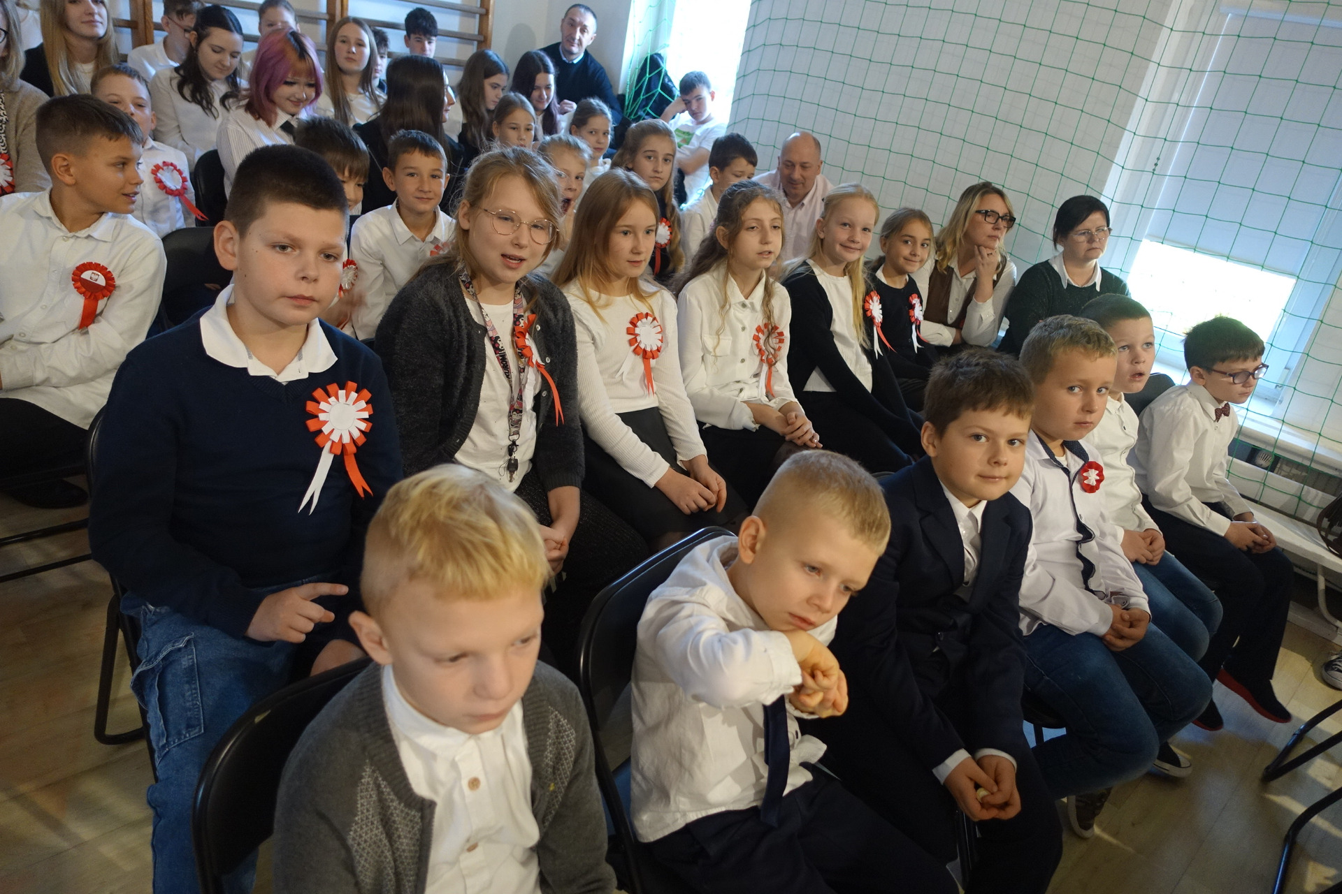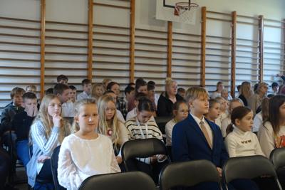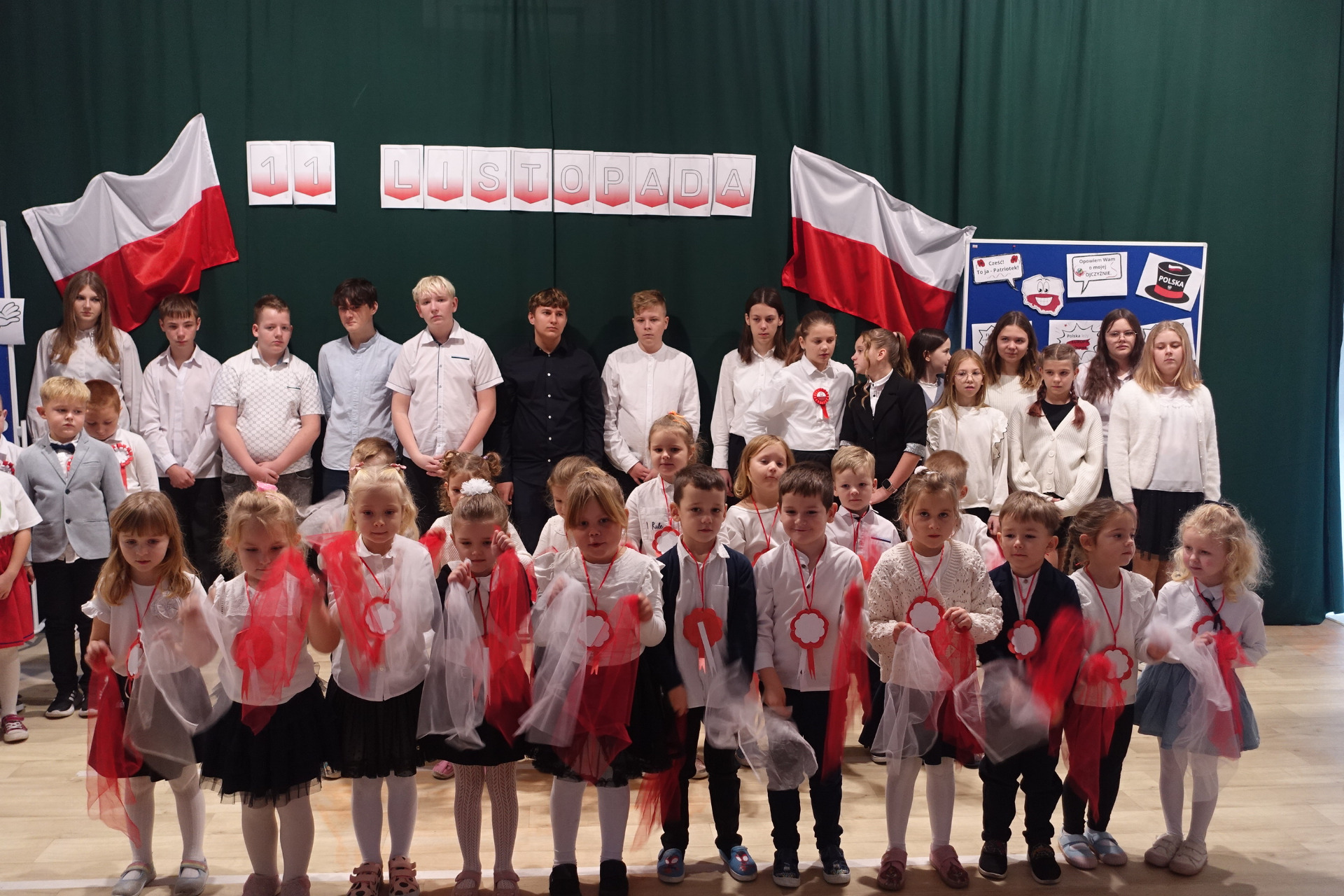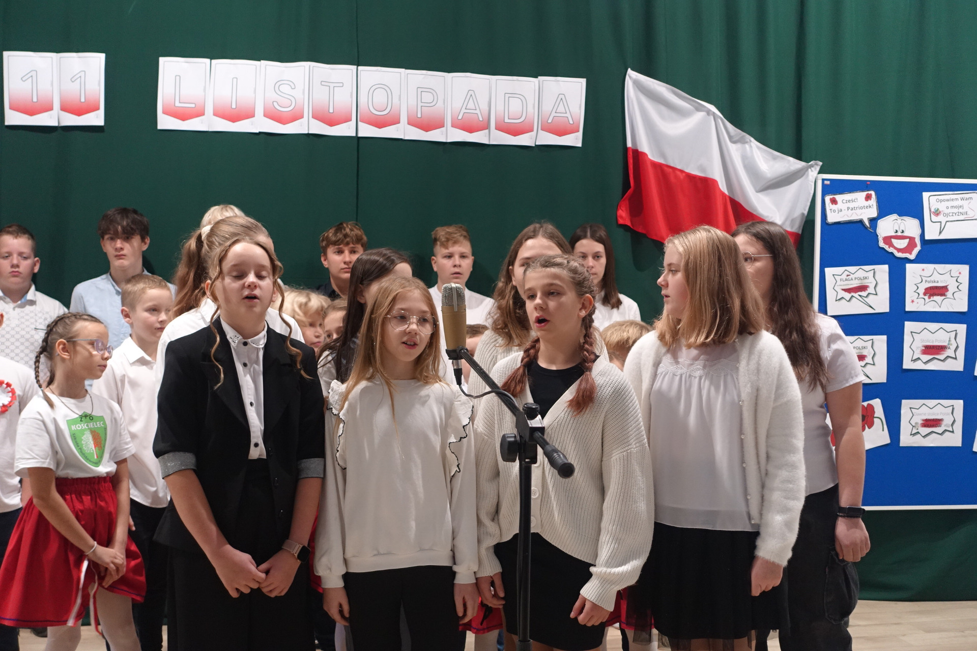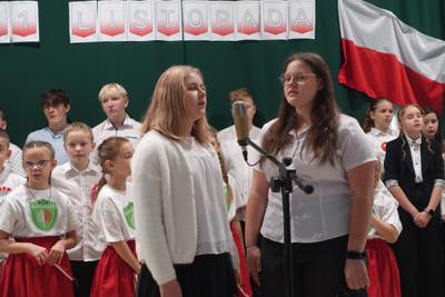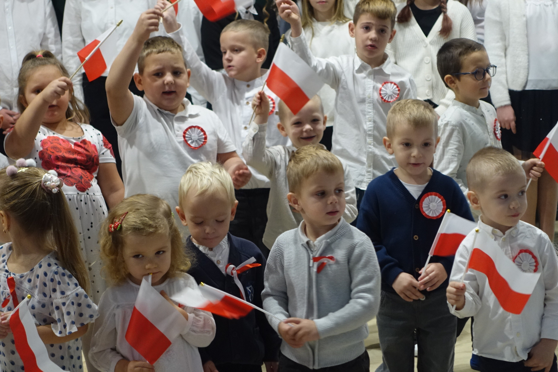 –tymi słowami piosenki przedszkolacy rozpoczęli uroczyste piątkowe spotkanie szkolnej społeczności z okazji Święta Niepodległości. 107 rocznica odzyskania niepodległości zgromadziła przedszkolaków, uczniów, nauczycieli oraz rodziców kościeleckiej placówki, a została uczczona we wzruszających słowach wierszy, pieśni oraz przepięknego wykonania poloneza przez uczniów klasy 2. Dyrektor szkoły p. Dorota Tulibacka podkreśliła znaczenie słynnych słów Jana Pawła II: