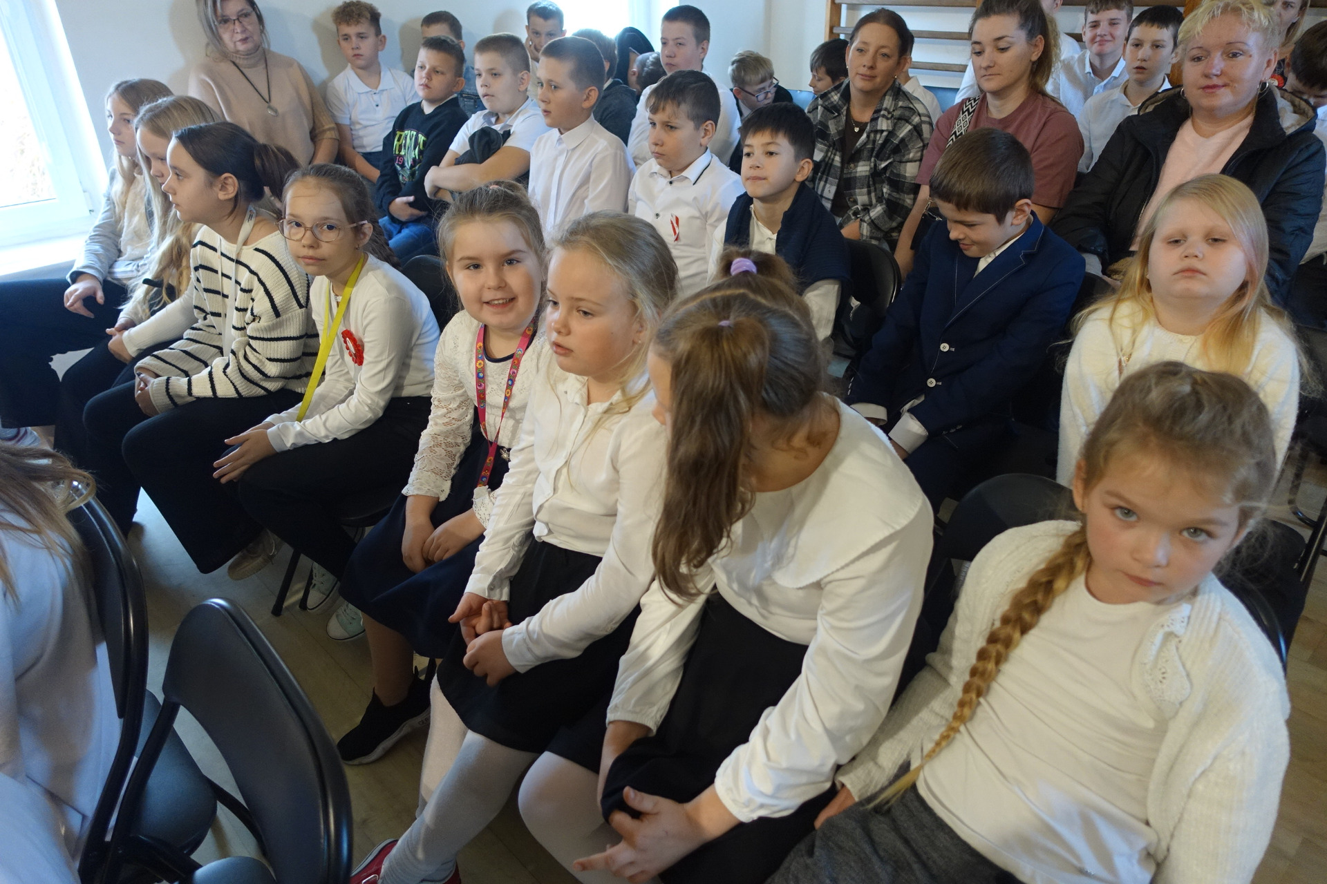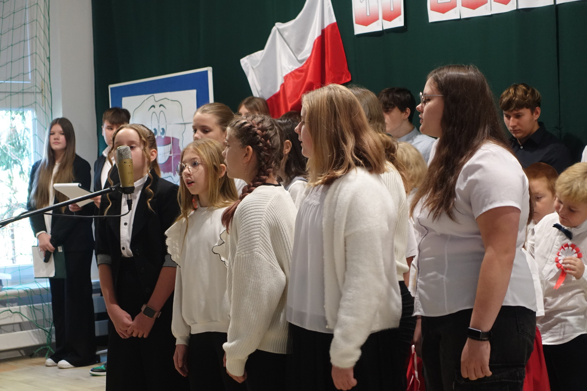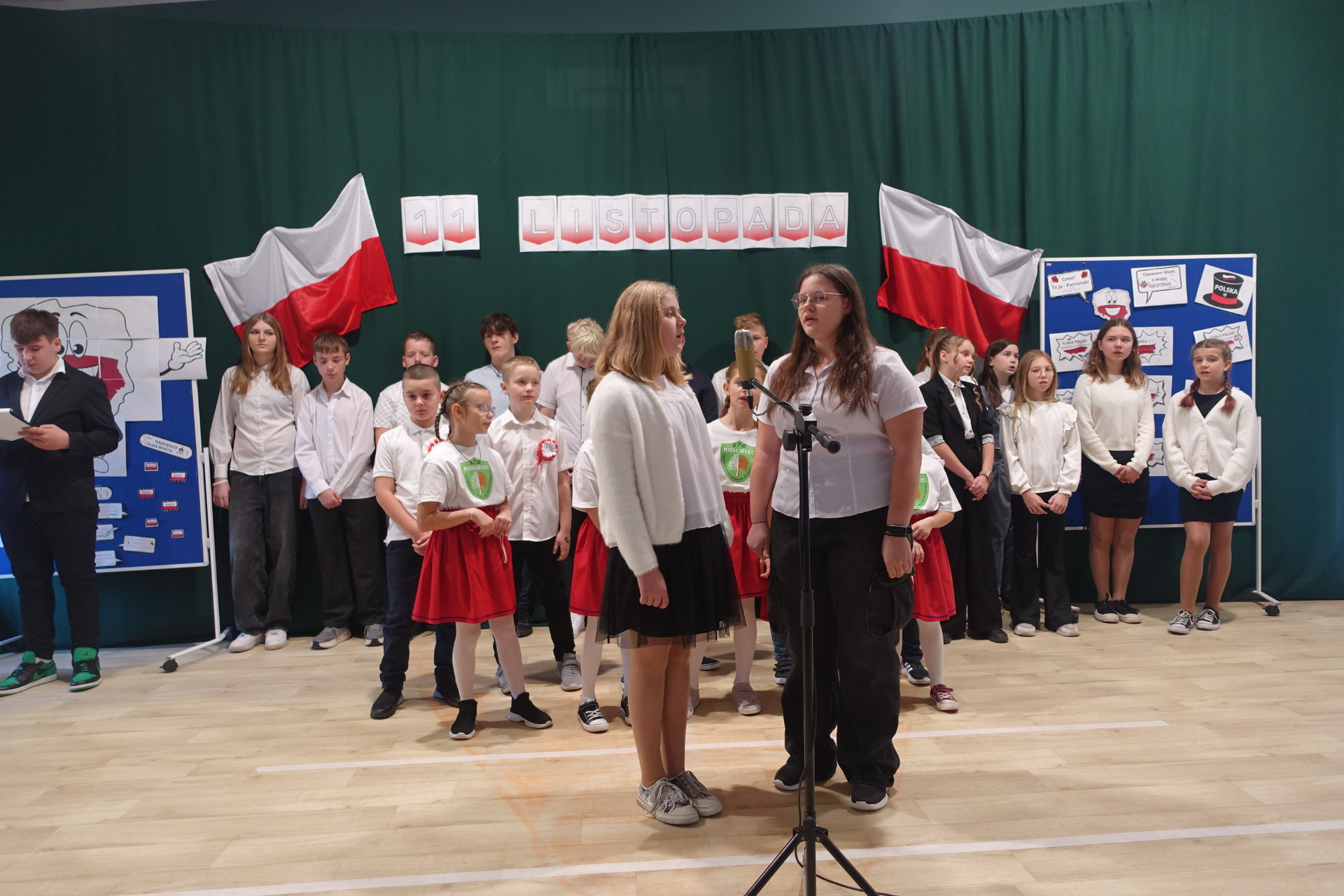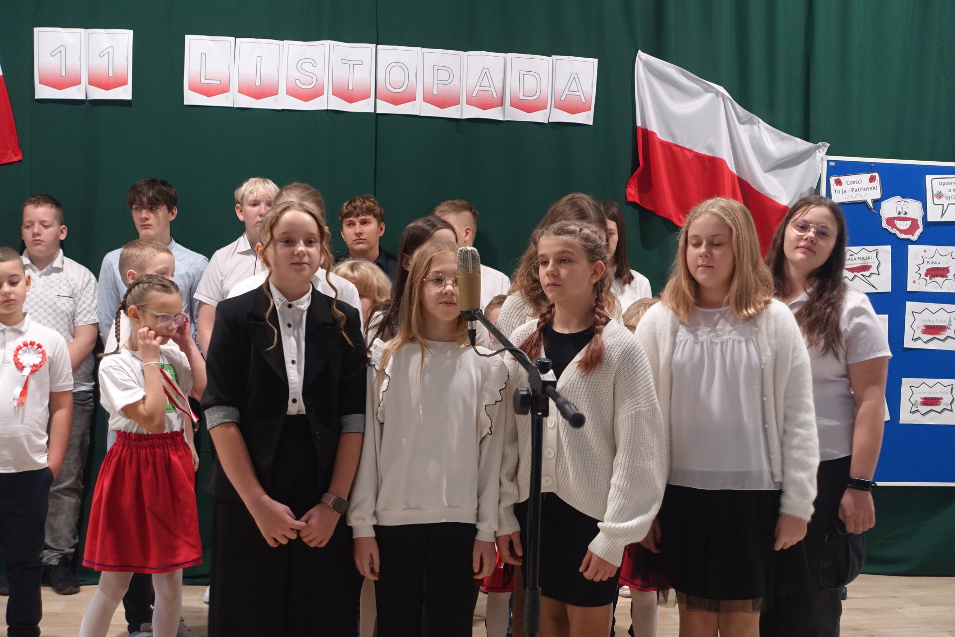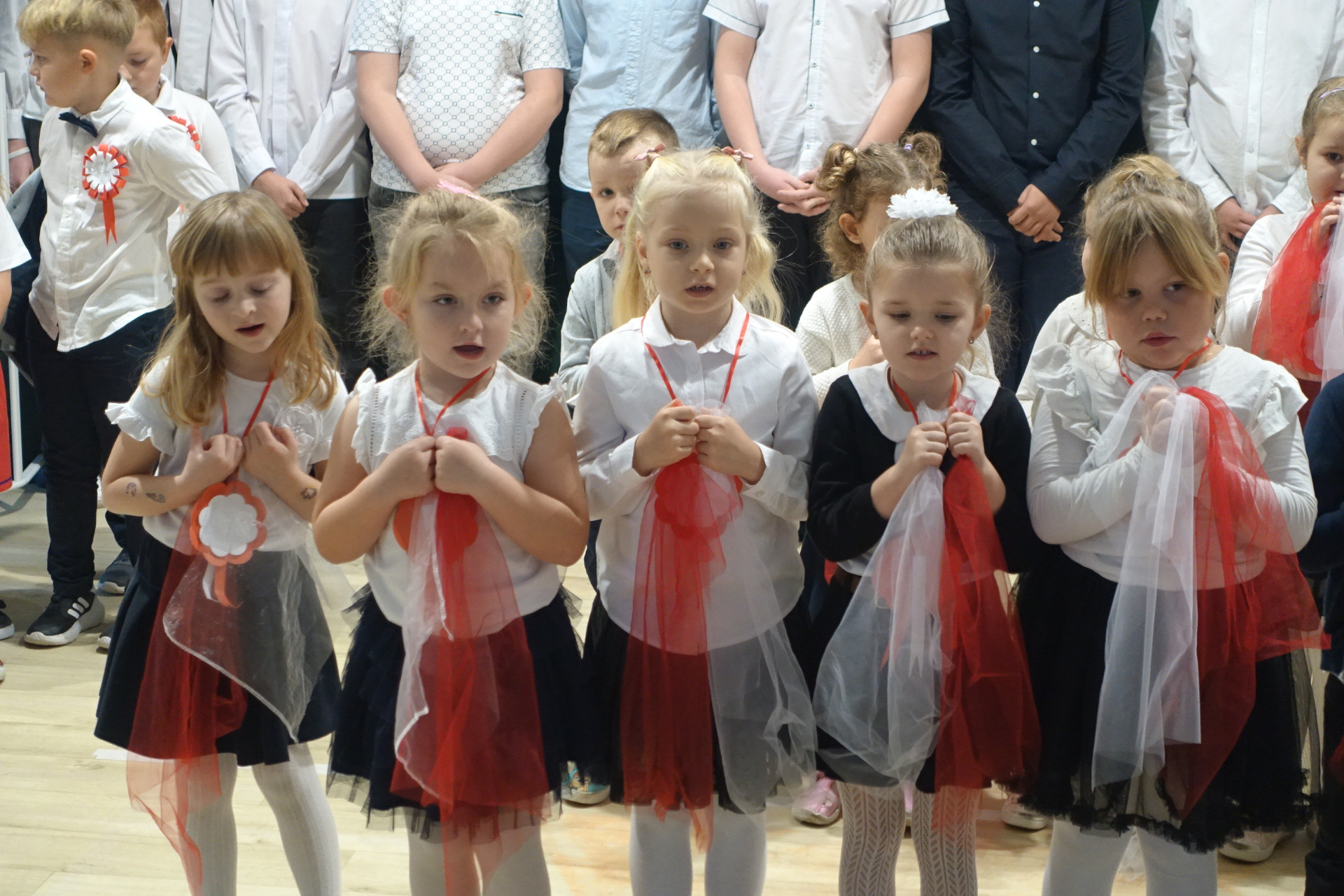–tymi słowami piosenki przedszkolacy rozpoczęli uroczyste piątkowe spotkanie szkolnej społeczności z okazji Święta Niepodległości. 107 rocznica odzyskania niepodległości zgromadziła przedszkolaków, uczniów, nauczycieli oraz rodziców kościeleckiej placówki, a została uczczona we wzruszających słowach wierszy, pieśni oraz przepięknego wykonania poloneza przez uczniów klasy 2. Dyrektor szkoły p. Dorota Tulibacka podkreśliła znaczenie słynnych słów Jana Pawła II:
